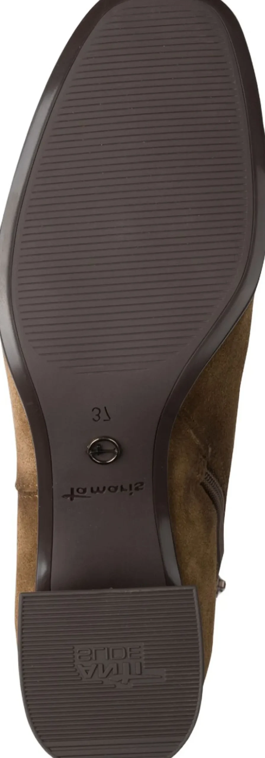 Enkel kort støvle i camel farvet ruskind, med indvendig lynlås og på en flot elegant blokhæl på 55 mm. Skafthøjde er 14 cm og der er Antislide og Antichok i hælen. I dæksålen er der Touch it effekt