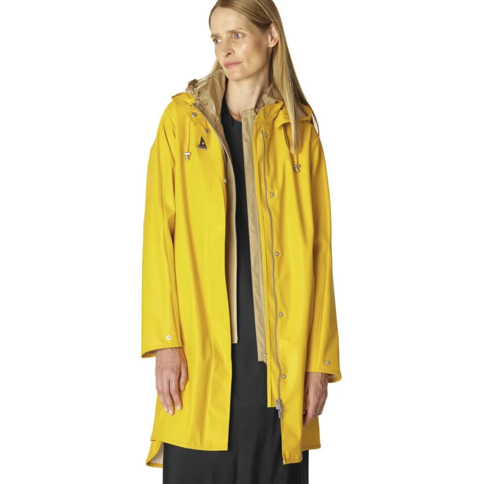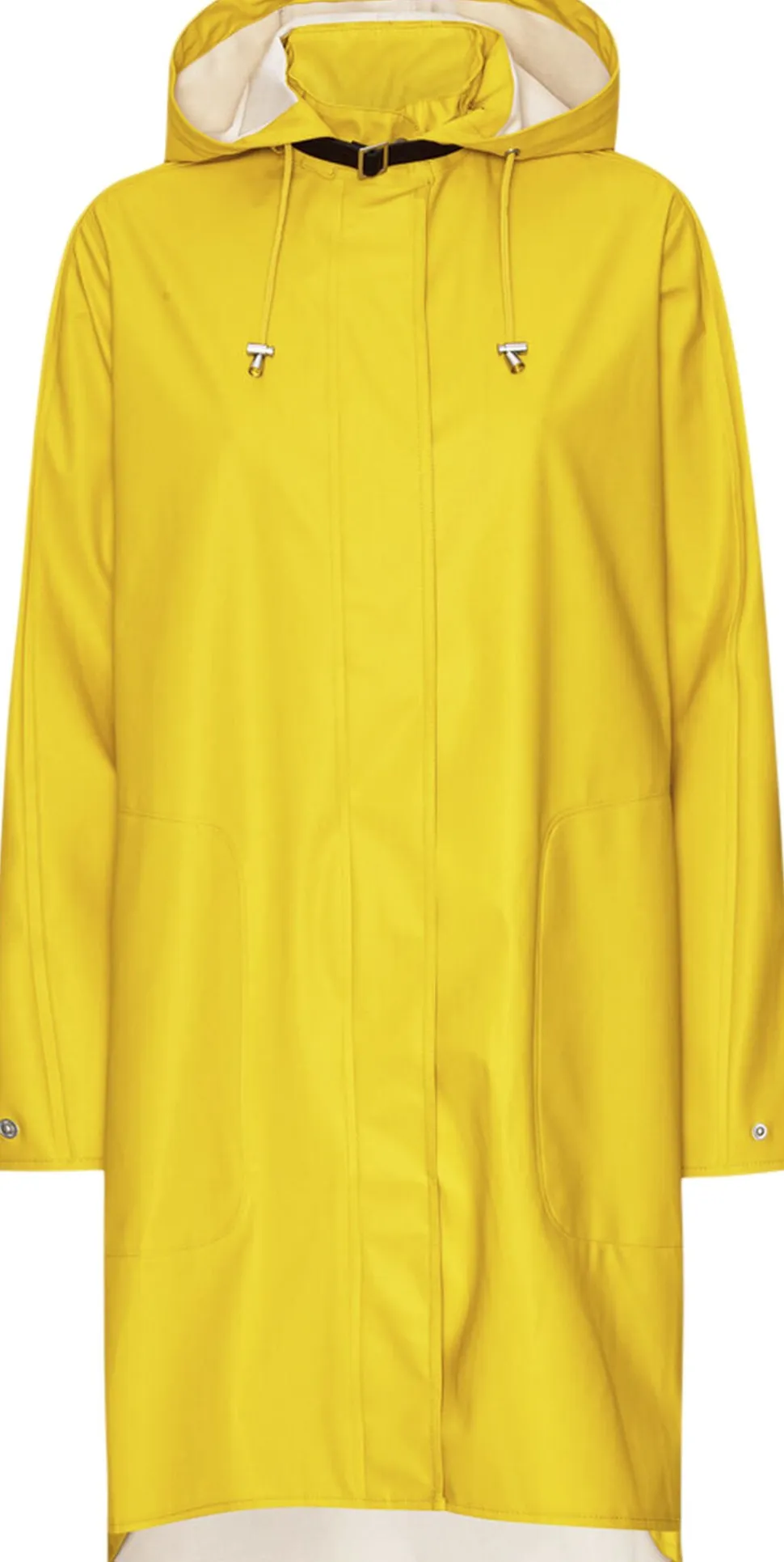 En feminin A-formet regnfrakke med Løs pasform under knæet. Regnfrakken har et diskret Ilse Jacobsen Hornbæk-logo præget på venstre ærme. Hætten er aftagelig og fastgjort med en vejrbestandig strop i kunstlæder. Stilen har sidelommer med flapper, smarte slidser i sidesømmene med trykknapper, knaplukning ved håndleddet og en 2-vejs YKK-lynlås midt foran. Indvendigt har stilen en ren og fin finish med et logobånd. Kvaliteten er en let og subtil vandtæt gummibelagt PU med polyester tricot på bagsiden, og alle sømme er dobbeltsvejsede. Stilen fås i et bredt udvalg af både klassiske og sæsonbestemte farver. Sammensætning: 100 % polyester trikot med PU-belægning. Funktionalitet: B/P 5000 mm