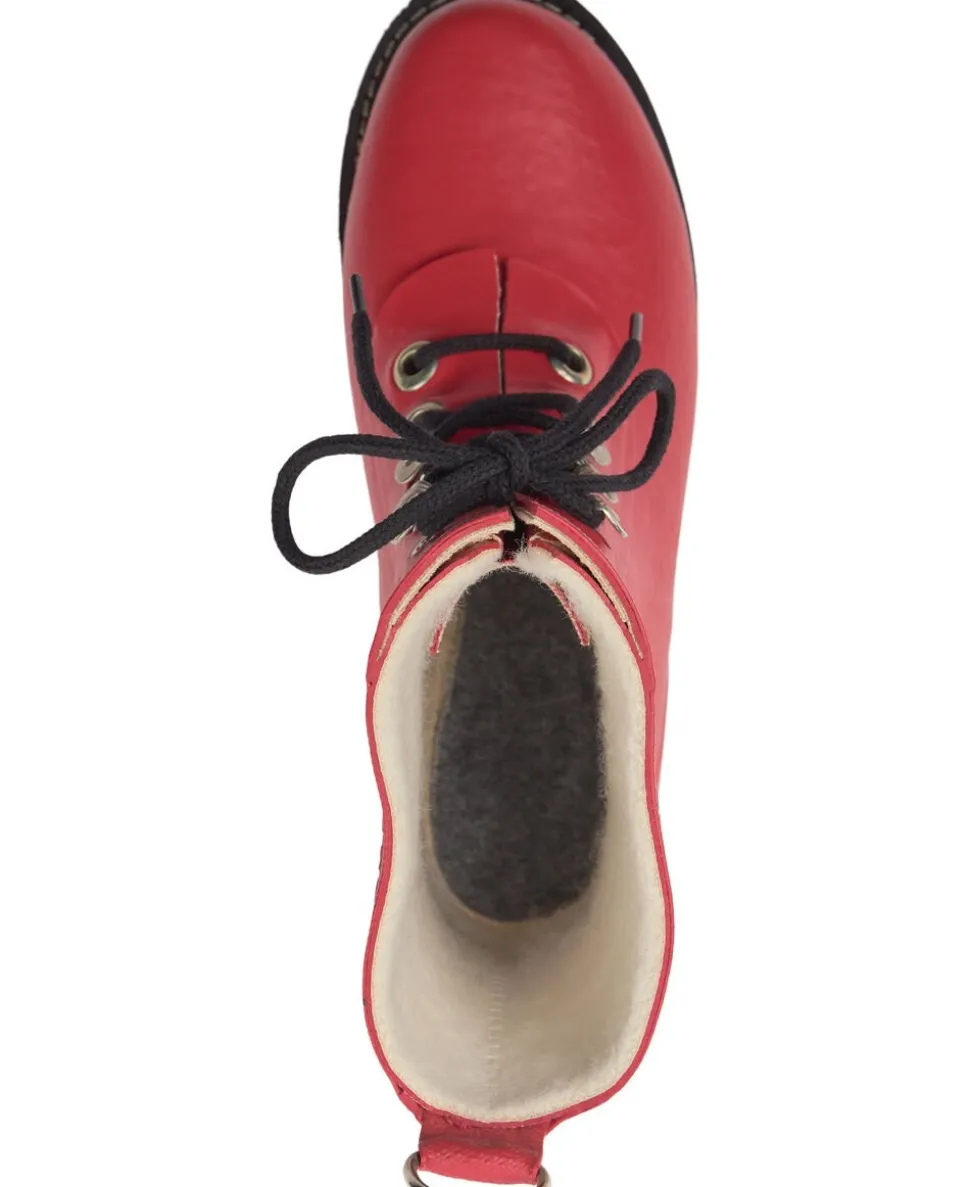 Short laced rubber boots by Ilse Jacobsen, featuring a decorative D-ring at center back and logo on the shaft. These wellingtons are made of sustainably harvested natural rubber and have been cut by hand. This material can withstand temperatures down to -20 degrees Celsius. The rubber composition is 80% pure, natural rubber and 20% secret formula. Entirely PVC-free, our boots contain no animal by-products. If not treated regularly, natural rubber will develop a white surface over the years. This is simply because the rubber loses its essential oil. To keep your boots in great condition for many years to come, we recommend that you treat them once a month with our oil. New laces are available in several colors.