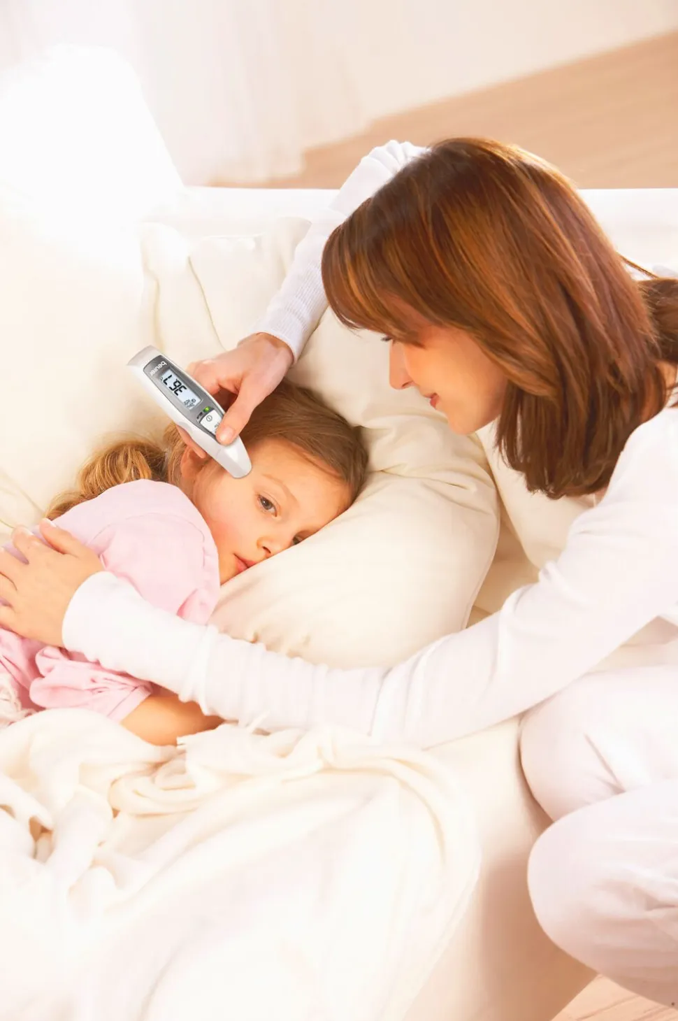 • Feberalarm: Termometeret har en indbygget feberalarm, der lyser rødt, hvis temperaturen er over 38°C. En grøn indikator betyder, at temperaturen er god.