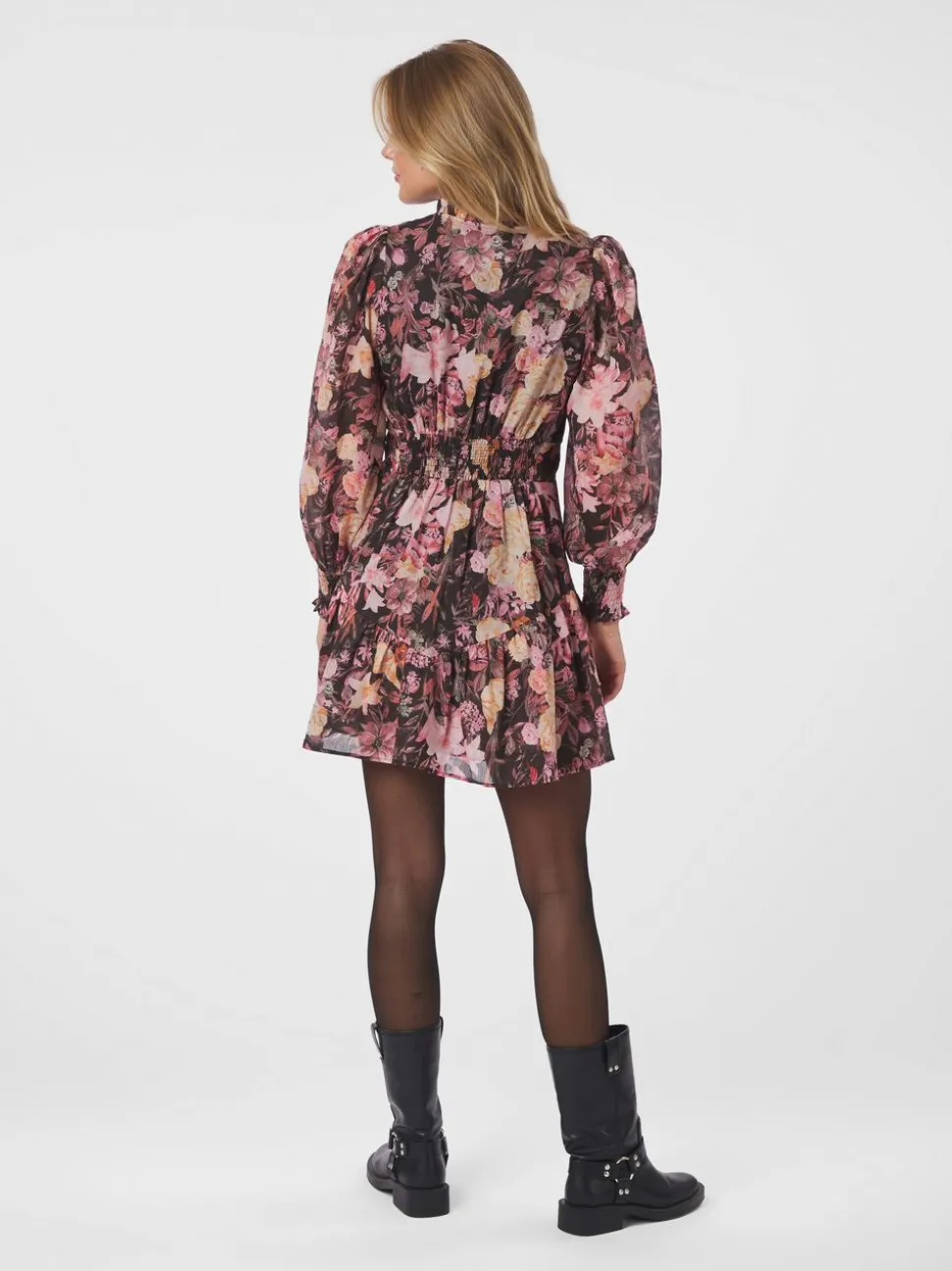 Kort kjole med blomsterprint. Kjolen har en rund halsudskæring med en lille flæsekrave, lange ærmer med tætsiddende smockmanchetter og lukkes med knapper langs fronten. Den har en almindelig pasform. Modellen er iført størrelse 36.