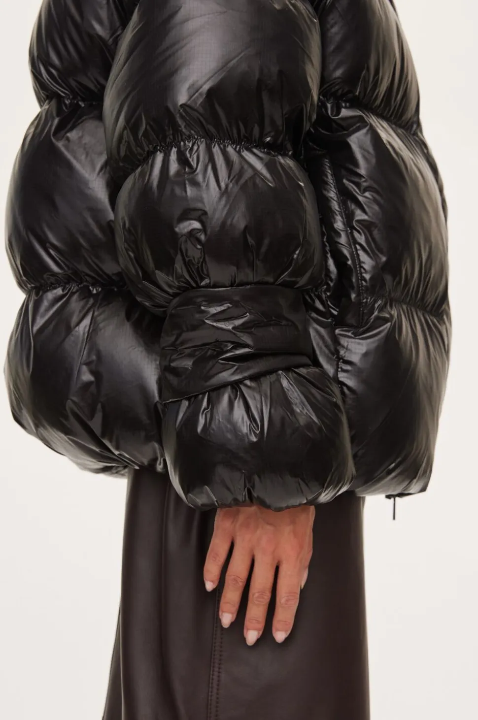 Pufferjakke med hætte. Fremstillet med Recycled polyamid og polstret fyld. De har en høj krave med stolpelukning, skjult lynlås og trykknaplukning foran. Aftagelig hætte, der fastgøres med lynlås, og to skjulte sidelommer. Elastisk snøre med stoppere i taljen og nederst på ærmerne og elastiske manchetter. Fuldt foret. Løs pasform med en voluminøs silhuet, der kan trækkes ind med snoretræk