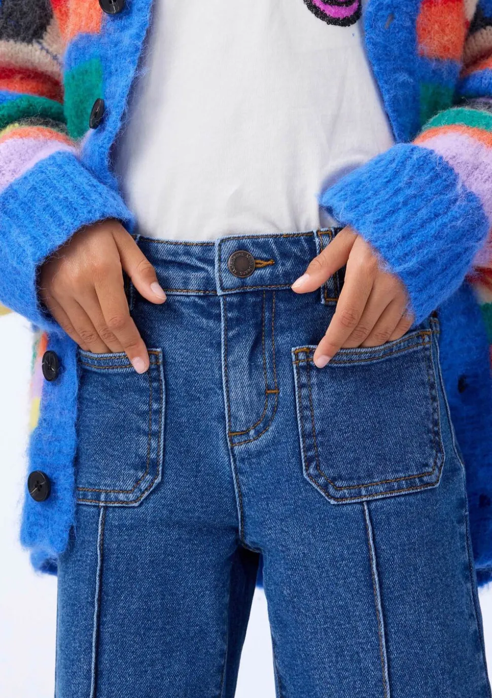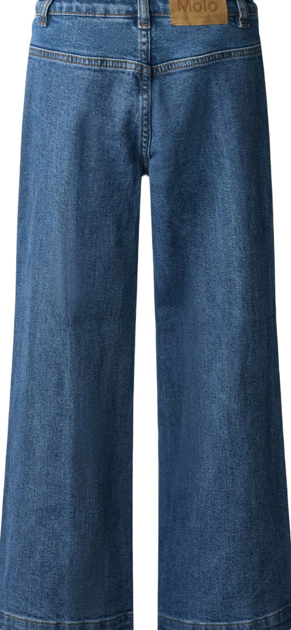 Disse denimblå 70’er jeans fra Molo er lavet af økologisk bomuld med syet pressefold. Buksen har trykknap- og lynlåslukning, bæltestropper og en indvendig justerbar knap i taljen for en god pasform. Den har en trompetformet silhuet og påsyede lommer på fronten. Livvidden kan justeres med en indvendig elastik for optimal pasform til alle børn. Størrelser 92-134 har trykknap, mens størrelser 140-176 har en almindelig jeansknap.