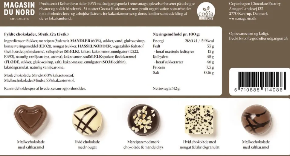 Fyldte chokolader fra Magasin du Nord Chocolate med 5 forskellige smagsvarianter i en dekorativ æske med 30 chokolader. Chokoladerne er produceret i Danmark og er lavet af udsøgte råvarer. Forkæl dig selv eller en du har kær med denne smukke gaveæske.