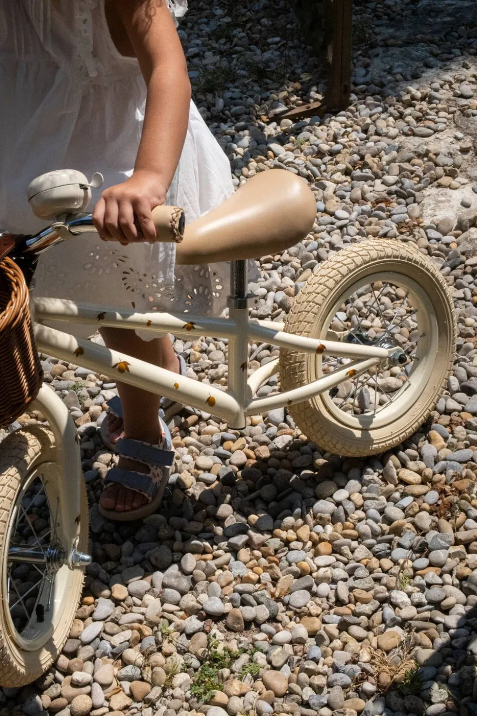 Ramme og klokke er lavet af stål, mens sædet og håndtaget er lavet af kunstlæder. Gummihjulene giver en jævn kørsel. Denne cykel leveres også med en kurvekurv. Cyklens mål er H-63cm x W-44cm x L-86cmkurven måler H-15cm x W-17cm x L-21cm. Den minimale sædehøjde er 37 cm, og den maksimale sædehøjde er 44 cm. Styrehøjden kan justeres fra 55 til 63 cm, og cyklen har 12 tommer hjul. Bemærk, at der skal bæres beskyttelsesudstyr, og at cyklen ikke må bruges i trafikken. Den skal samles af en voksen, da den indeholder skarpe punkter og kanter samt små dele inden samling. Dette produkt er egnet til børn på 24 måneder og derover. Pakningsstørrelsen er L-74cm x W-38,5 cm x D-15cm