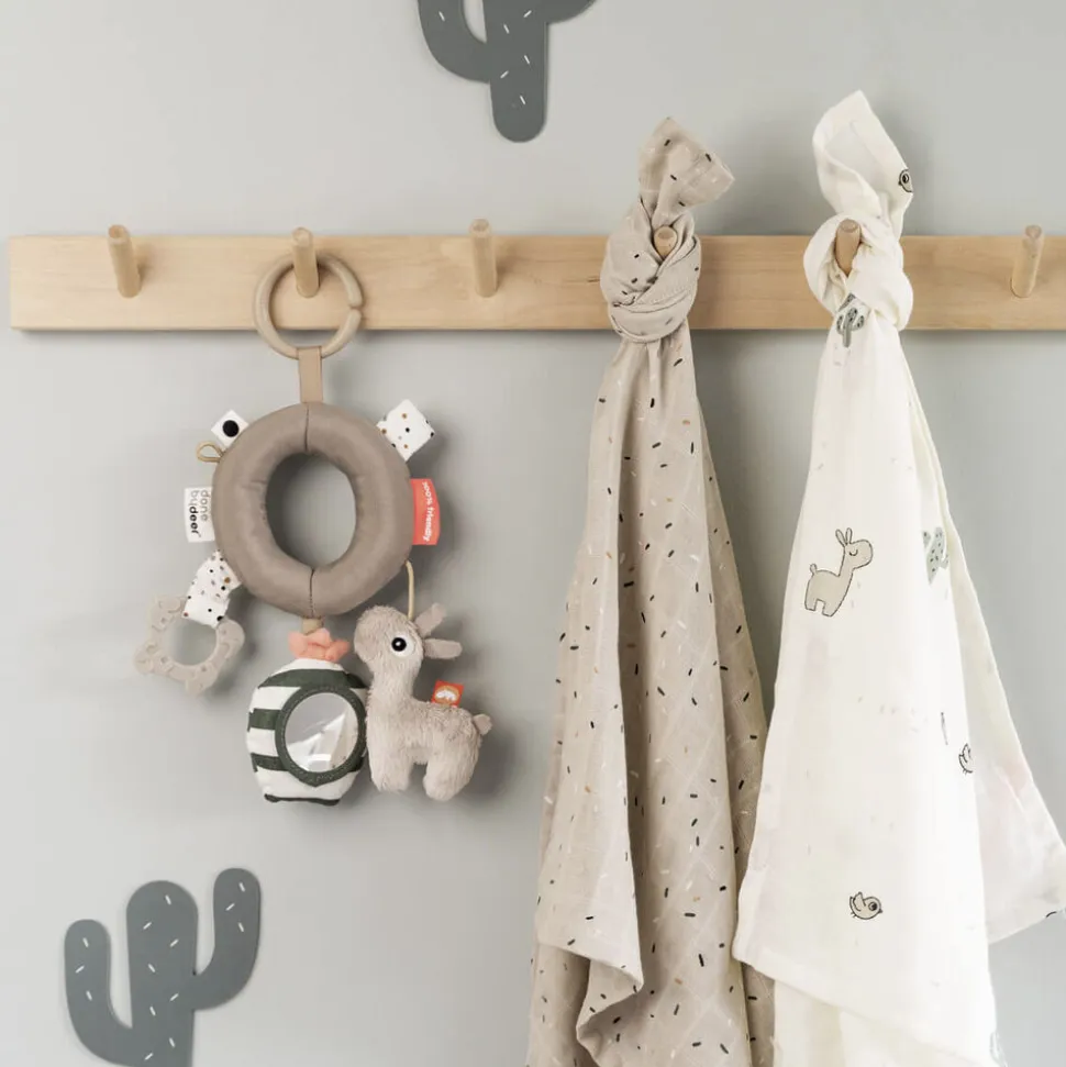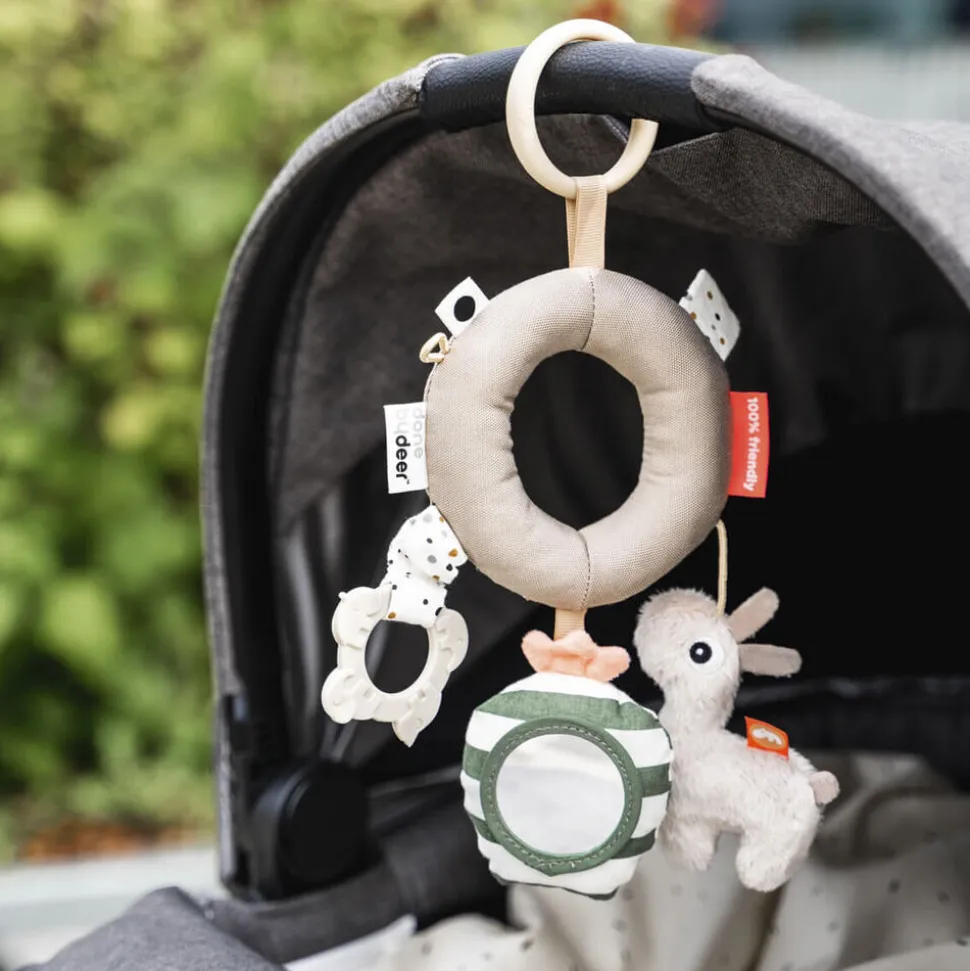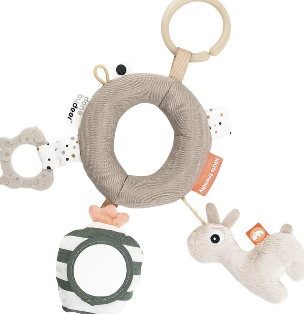 Aktivitetsringen opmuntrer babyer til at være nysgerrige og undersøge sansefunktionerne: en blød bidering til lindring af ømme gummer, et spejl med rangle, en blød Lalee, knitrelyde og sjove tags. Legetøjet er let at holde om for små fingere og elastikringen kan holde en sut eller et andet stykke legetøj indenfor rækkevidde. Brug toy linket til at fastgøre aktivitetsringen til fx. en legemåtte, aktivitetsbue, klapvogn, autostol eller babyseng.