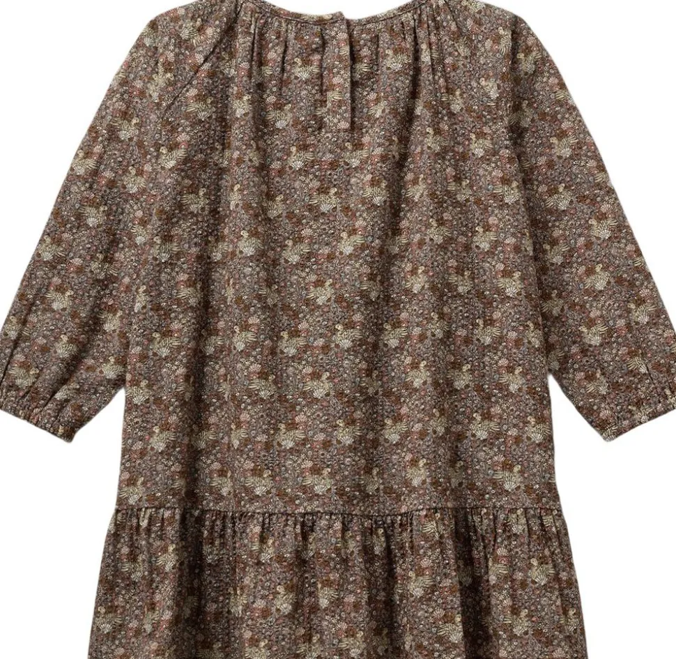 • Kjole med flæsekant • Brunt mønster med blomsterdetaljer og små ænder • Løs pasform • Elastik ved ærmekanten • Flæsekant nederst