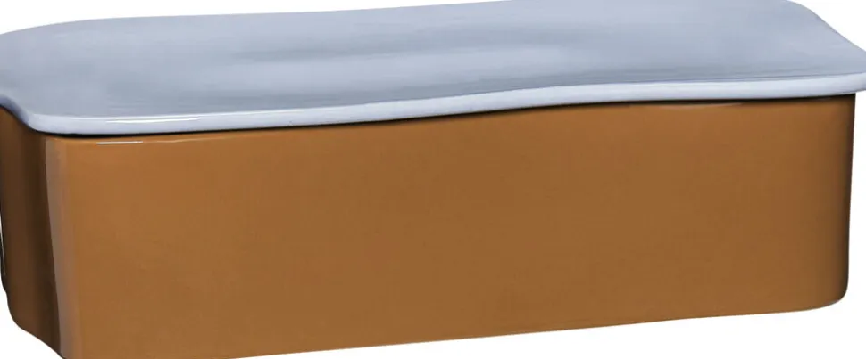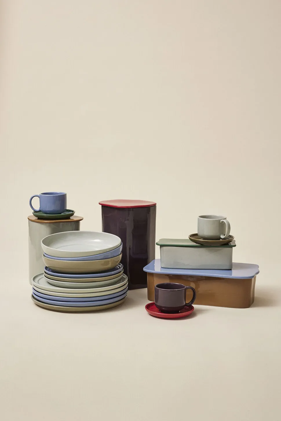 Stor opbevaringsløsning i keramik i sand med grønt låg.