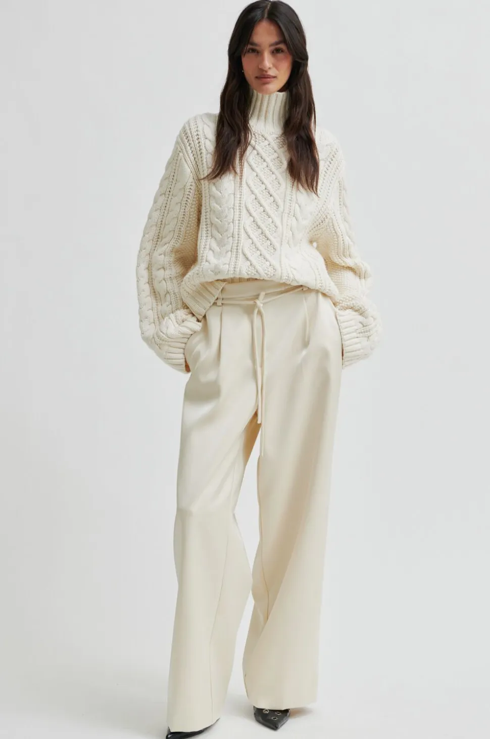 Second Female kabelstrikket pullover. Pulloveren er fremstillet i en blød bomuldsblanding med kraftig strik og kabeldetaljer. Med rullekrave og lange, vide ærmer. Ribkant ved hals, manchetter og forne