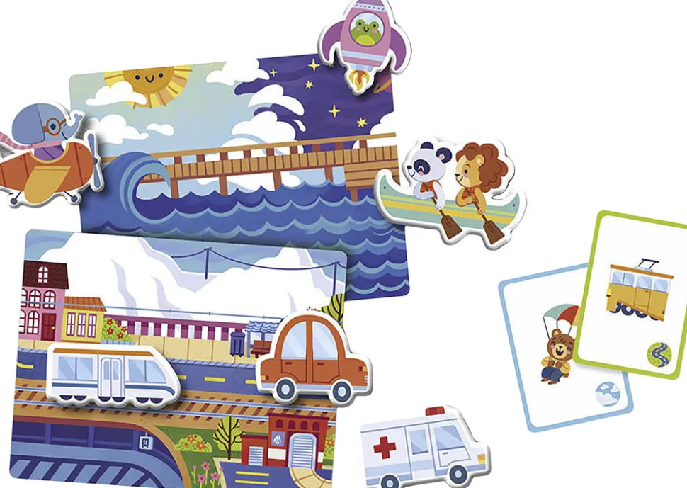 Æsken indeholder 2 baggrundsdekorationer til at bruge sammen med 42 magneter med transportmidler.