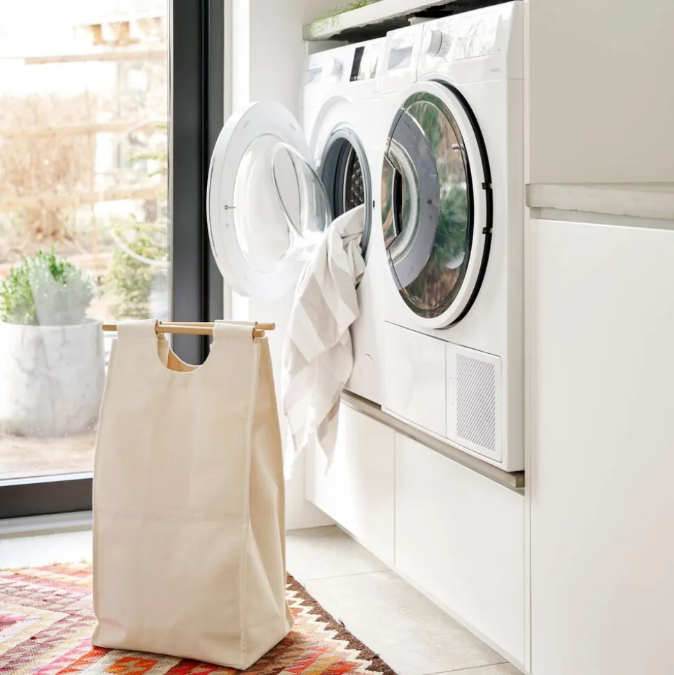 Tekstilposen fås i tre forskellige varianter, så du kan tilpasse opbevaringsløsningen til din personlige stil: en klassisk natur, en natur med kastanjerøde striber, eller en natur med koboltblå striber. Uanset hvilken du vælger, giver denne løsning dig mulighed for at tilføje et stilfuldt element til din indretning. Posens indvendige plastlag sikrer, at fugt fra eksempelvis vådt vasketøj holdes inde og med GOTS-certificeringen af tekstilposen kan du være sikker på, at materialet er fremstillet under bæredygtige og socialt ansvarlige forhold.