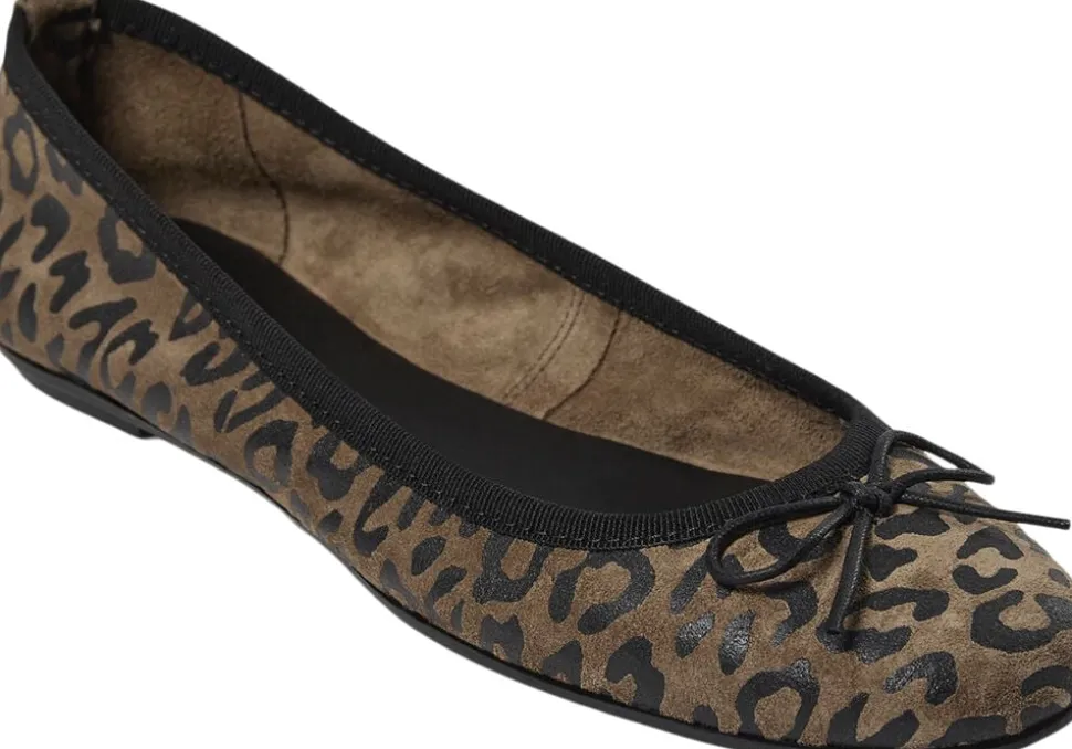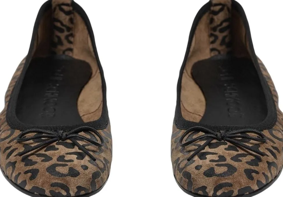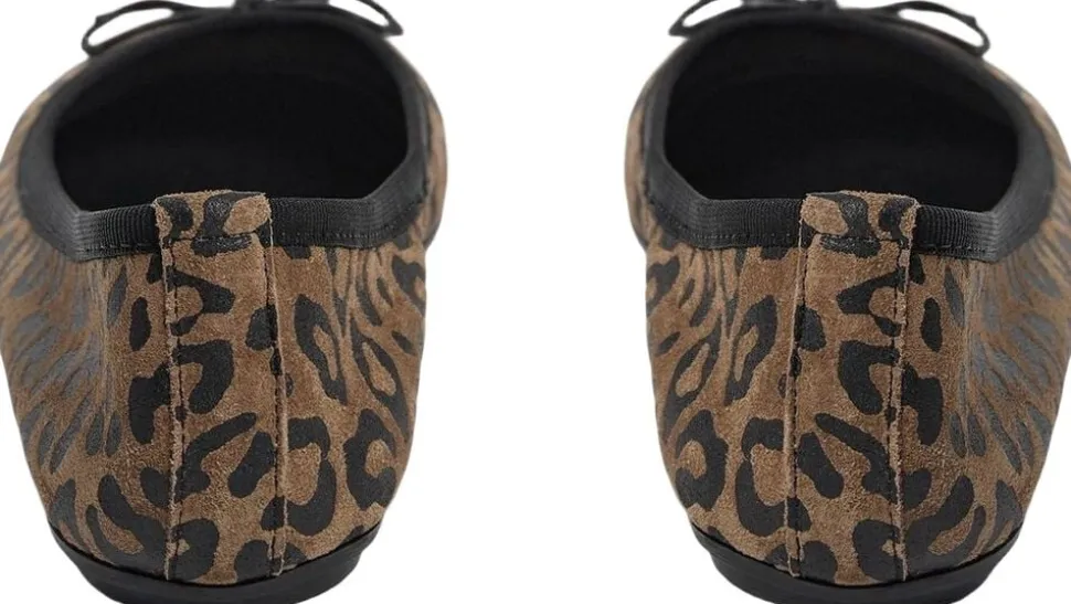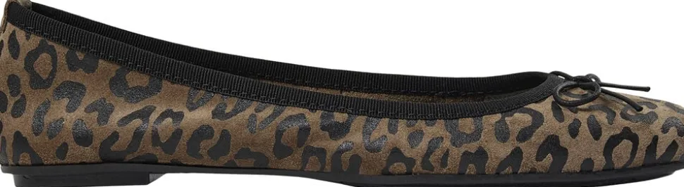 Sød ballerinasko i smuk leo print med sløjfe over vristen. Skoen er designet i 100% læder med gummisål