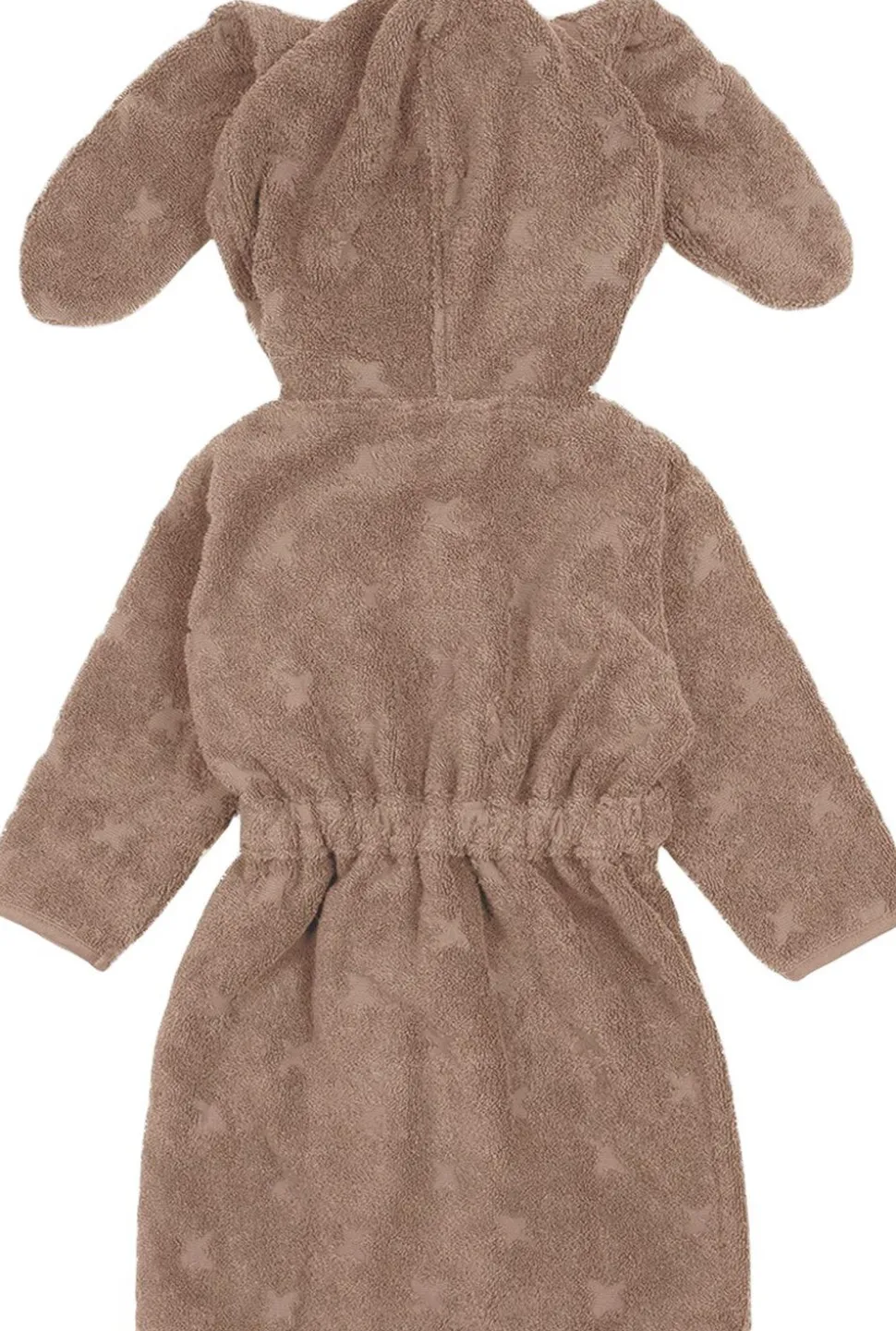 Super fin og blød badekåbe i den blødeste bomulds frotte. Praktisk bindebånd rundt om livet samt lommer fortil. Bindebåndet er påsyet bagpå så bæltet ikke falder af og bliver væk. Der er elastik i taljen så badekåben opnår en bedre pasform. Badekåben er udstyret med en dejlig stor hætte med lange kanin ører. (). Produktet er GOTS organic- certificeret, hvilket betyder at bomulden er certificeret økologisk, og at der i alle andre processer som farvning, strikning og syning er taget de strengeste hensyn til miljøet. GOTS er internationalt anerkendt som den førende standard for forarbejdning af tekstiler af økologisk bomuld. Derudover tages der også hensyn til arbejdsforholdene, hos dem der producerer tøjet. Økologisk bomuld 100%