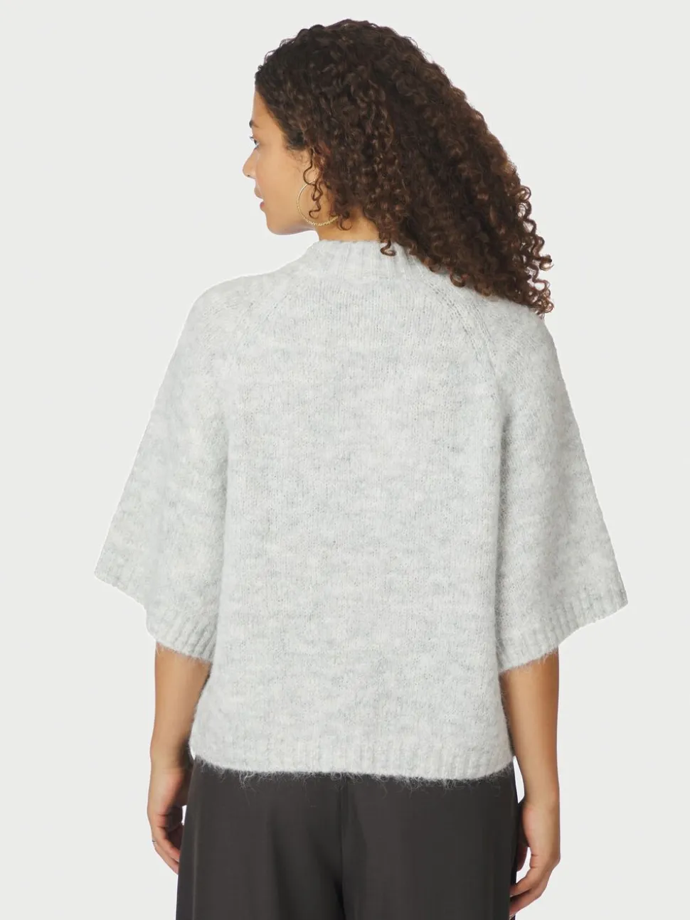 Cardigan med korte ærmer. Cardiganen har en rund halsudskæring, ærmer med vidde og en åben front med tre dekorative knapper. Den er lavet i en blød, fluffy kvalitet og har en løs pasform. Modellen er iført størrelse 36.