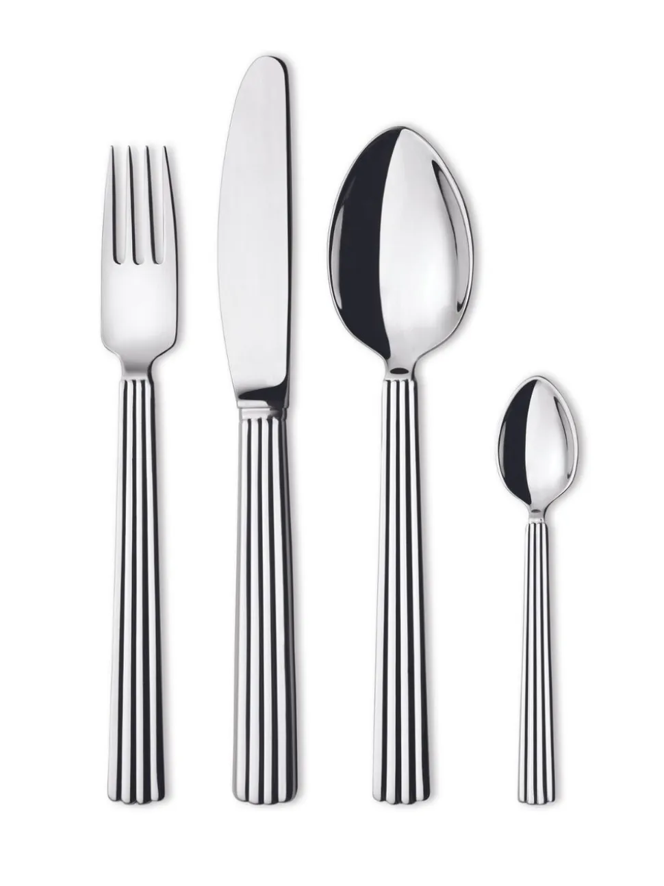 • Komplet sæt: Sættet består af en spiseske, en spisegaffel, en spisekniv og en teske. Du kan kombinere disse med resten af Bernadotte kollektionen for at skabe et fuldendt borddækning.