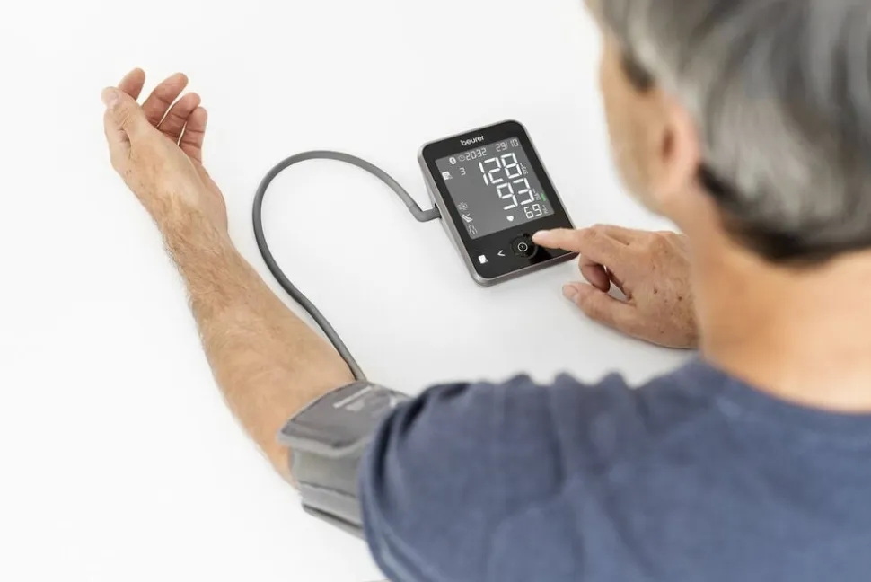 Beurer BM 64 blodtryksmåler til overarm med smart inflationsteknologi, hvor målingen foretages under oppustning af manchetten for et hurtigere resultat.