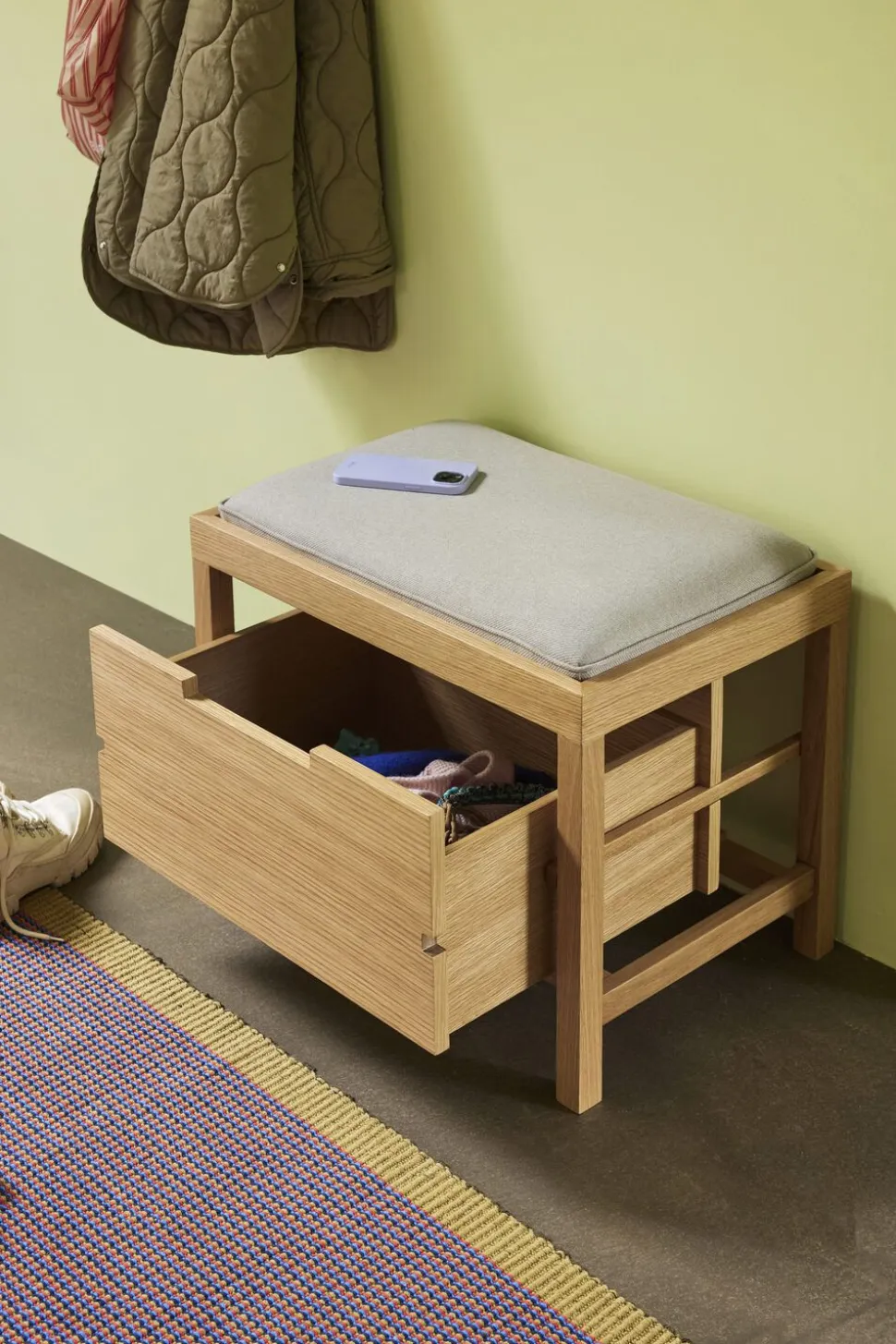 Oplev Bifi Bænken, en elegant ny tilføjelse til din bolig. Dette produkt kombinerer praktisk opbevaring med stil, idet det indeholder et smart opbevaringsrum under sædet, der er polstret for øget komfort. Denne bænk er ikke kun et møbel, men også en funktionel løsning til opbevaring af sko, hatte og tørklæder, så din entré forbliver ryddelig og indbydende. Bifi Bænken er det ideelle valg for ethvert hjem, der ønsker at tilføje et elegant og funktionelt møbel til entréen.