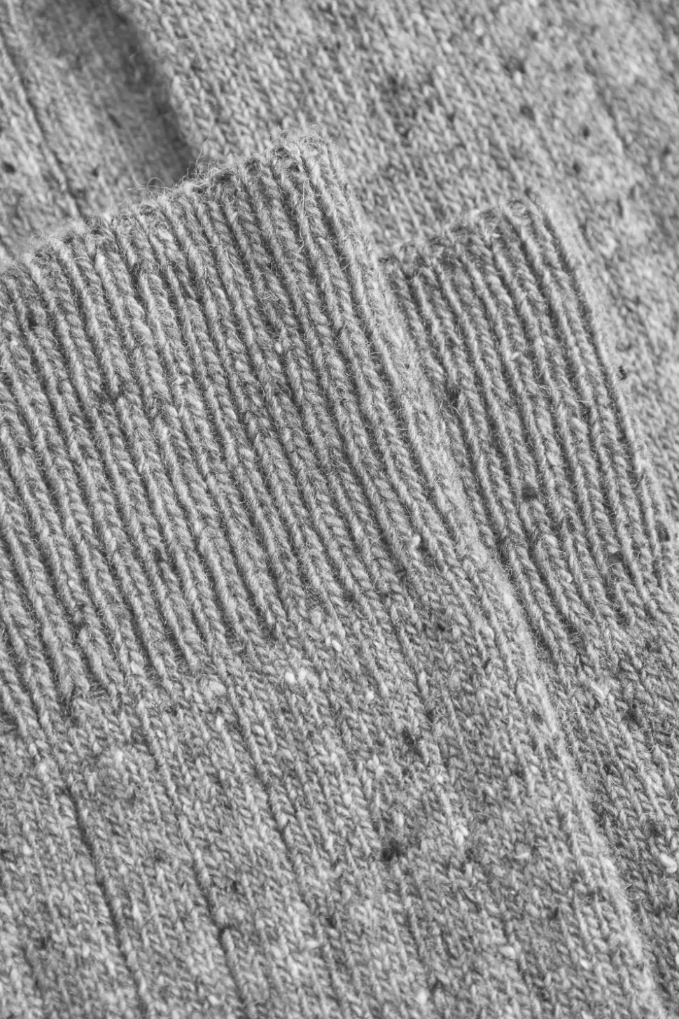 Strikket i et mellemstort bredt ribben fra en blanding af uld og silke med diskrete farveflager. Afsluttet med et varmeoverførselslogo på indersiden af buen