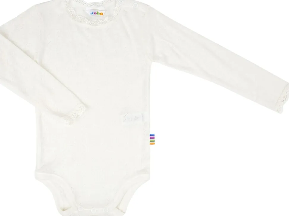 Blondekant ved halsen og på ærmer. Trykknapper på den ene skulder samt mellem benene. Ekstra fin uldkvalitet med silke. Utrolig blød med et lidt skinnende udtryk og sødt hulmønster. Ecolabel mærket.
