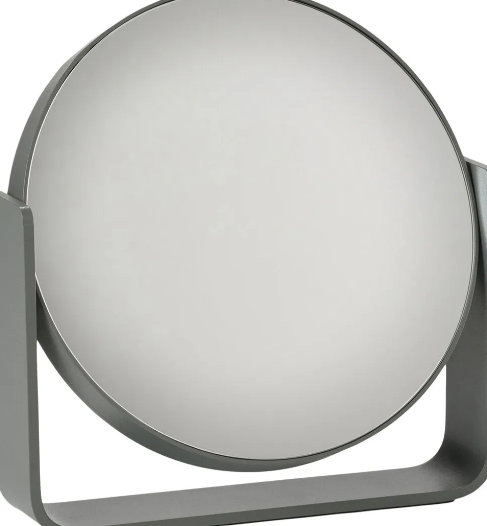 Uundværligt bordspejl, der pynter, hvor end du placerer det. Den ene side er almindeligt spejl, mens den anden forstørrer hele fem gange. Spejlet roterer sikkert om egen akse, da det bæres af en bred aluminiumsramme, som samtidig udgør spejlets stabile base. Det er pulverlakeret og har et fint mat look. Spejlet glider smukt ind i den populære UME-serie og fås i alle 7 farver: Black, White, Soft Grey, Grey, Eucalyptus, Taupe, Olive Green.