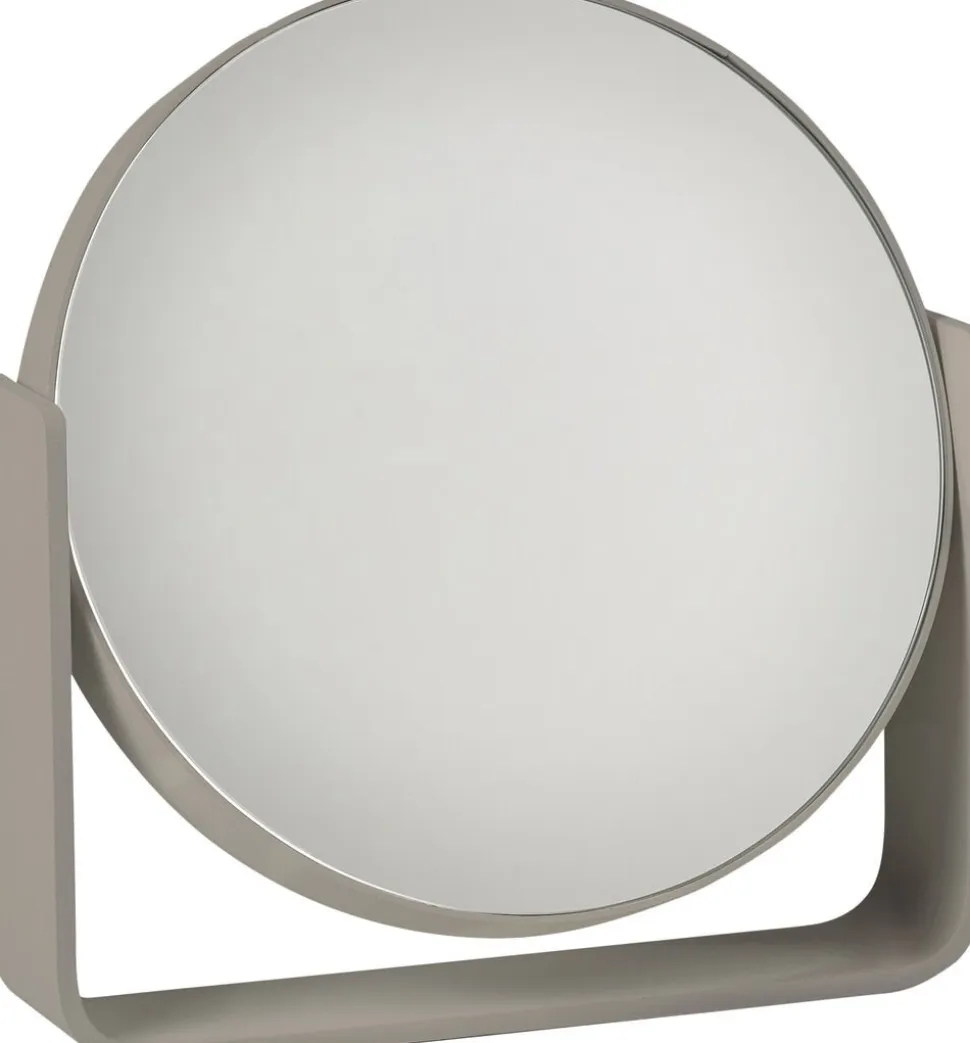 Uundværligt bordspejl, der pynter, hvor end du placerer det. Den ene side er almindeligt spejl, mens den anden forstørrer hele fem gange. Spejlet roterer sikkert om egen akse, da det bæres af en bred aluminiumsramme, som samtidig udgør spejlets stabile base. Det er pulverlakeret og har et fint mat look. Spejlet glider smukt ind i den populære UME-serie og fås i alle 7 farver: Black, White, Soft Grey, Grey, Eucalyptus, Taupe, Olive Green.