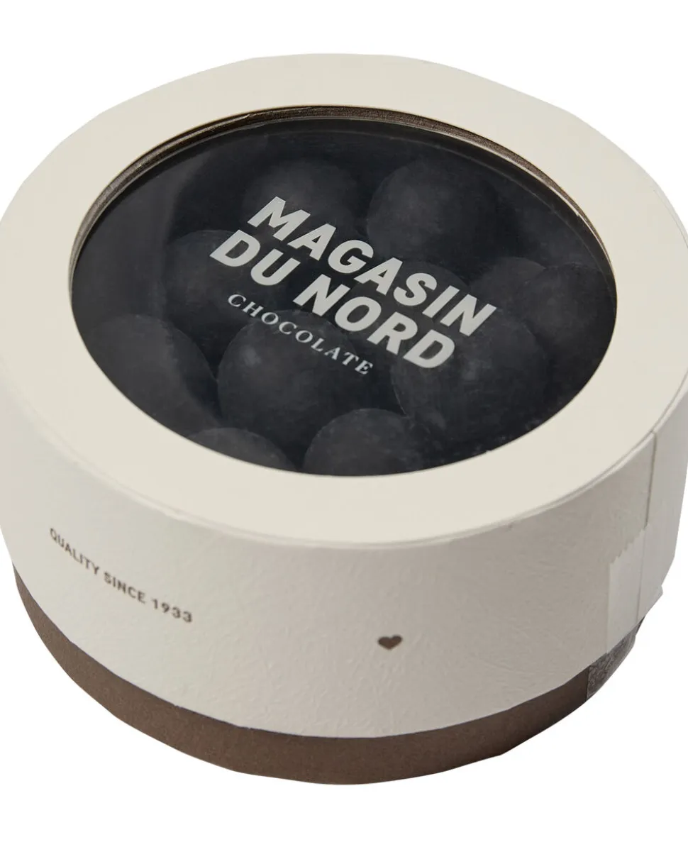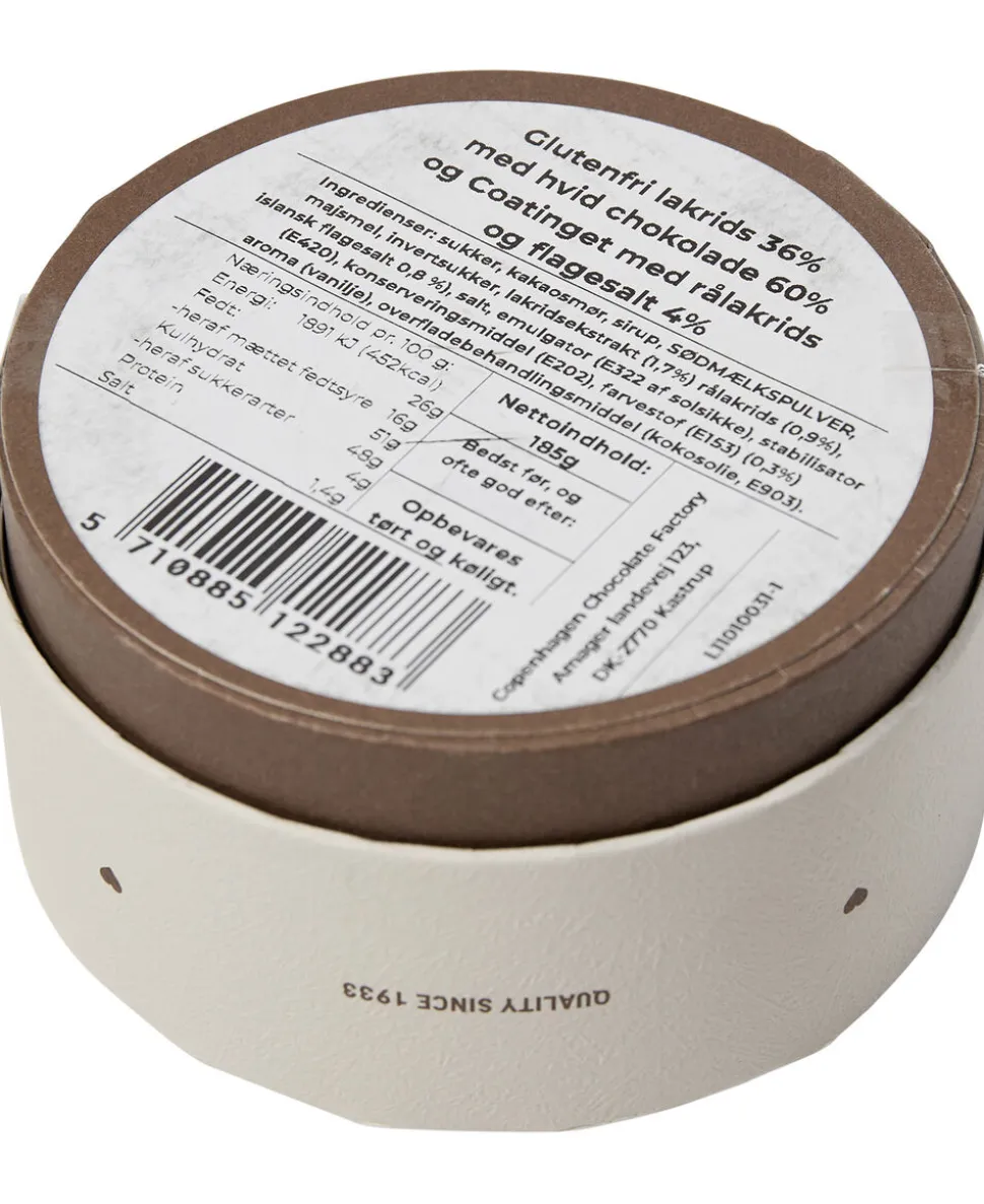 Lakridsdragé fra Magasin du Nord Chocolate med hvid chokolade og coating af rålakrids med flagesalt i en dekorativ æske. Lakridsen er glutenfri, produceret i Danmark og er lavet af udsøgte råvarer. Forkæl dig selv eller en du har kær med denne fine gaveæske.