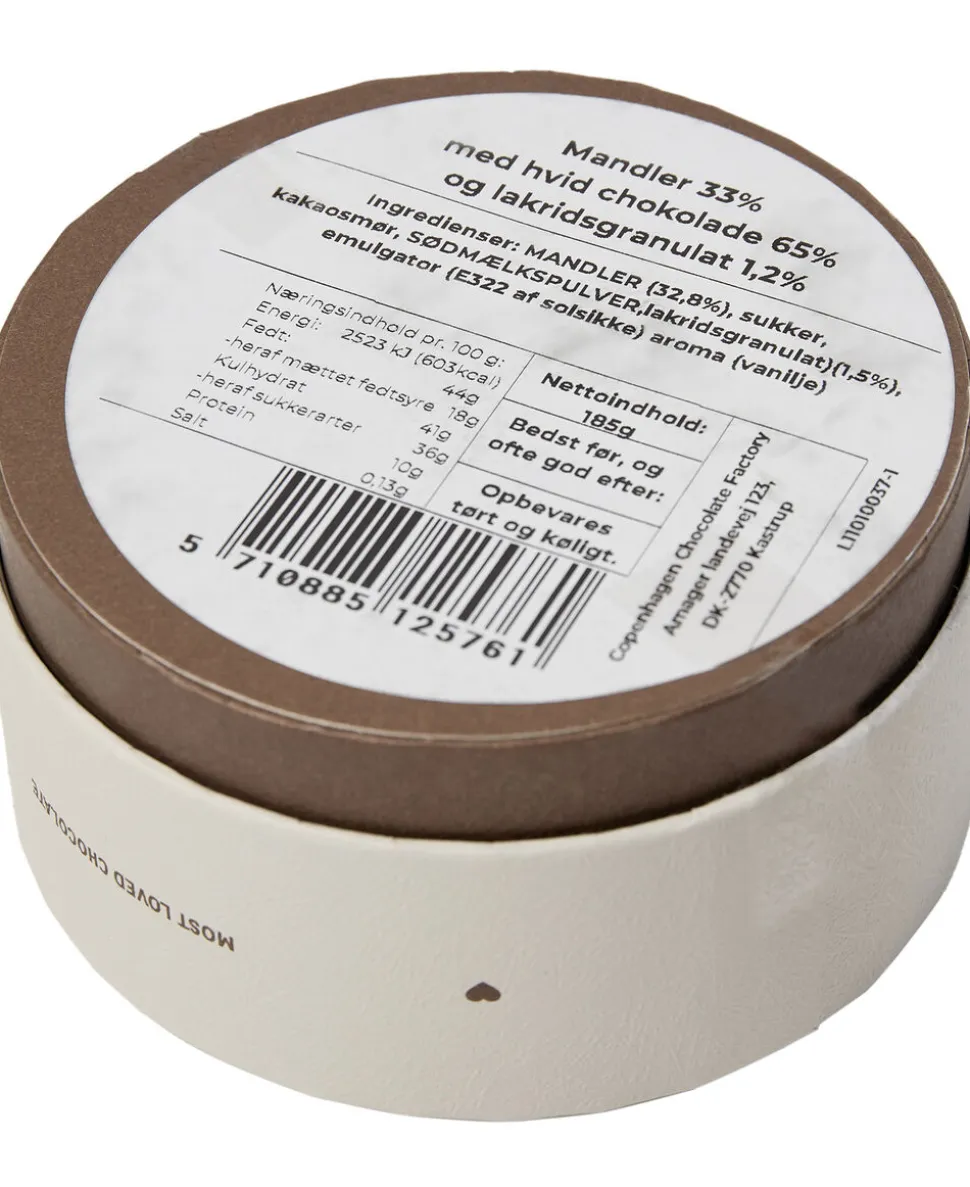 Mandeldragé fra Magasin du Nord Chocolate med hvid chokolade og lakridsgranulat i en dekorativ æske. Mandeldragén er produceret i Danmark og er lavet af udsøgte råvarer. Forkæl dig selv eller en du har kær med denne fine gaveæske.