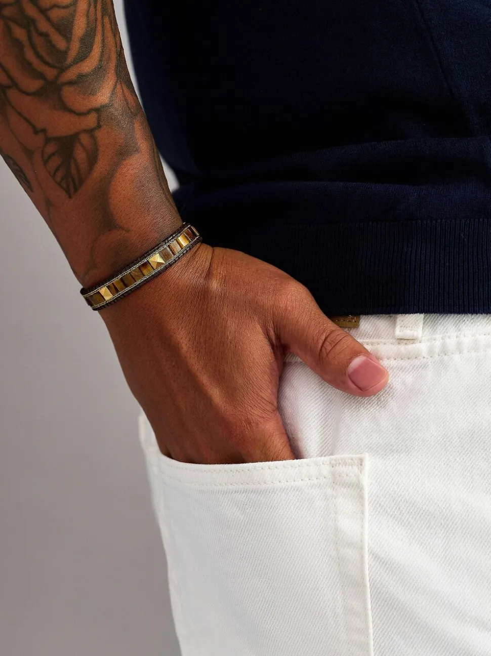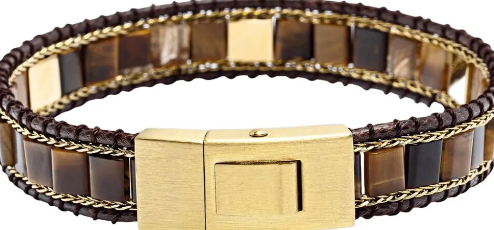 Herre Brown Tiger Eye Stud armbånd, 10 mm armbåndsbredde, 6 mm Brown Tiger Eye polerede perler, børstet 18K guldbelagt lås og stropper, vævet streng og kædedetaljer. Håndlavet i Los Angeles