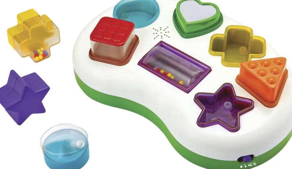 Put-i-boks med lys. lyde og forskellige funktioner Med blinkende lys og melodier når du sætter klodserne i hullerne samt 3 indstillinger/måder at lege på Bruger 3 stk AA-batterier