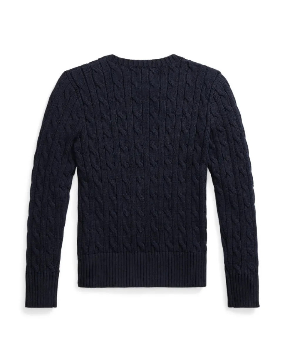 Denne sweater med rund hals er kabelstrikket med mellemvægtskæmmet bomuld og fuldendt med vores signaturbroderede Pony