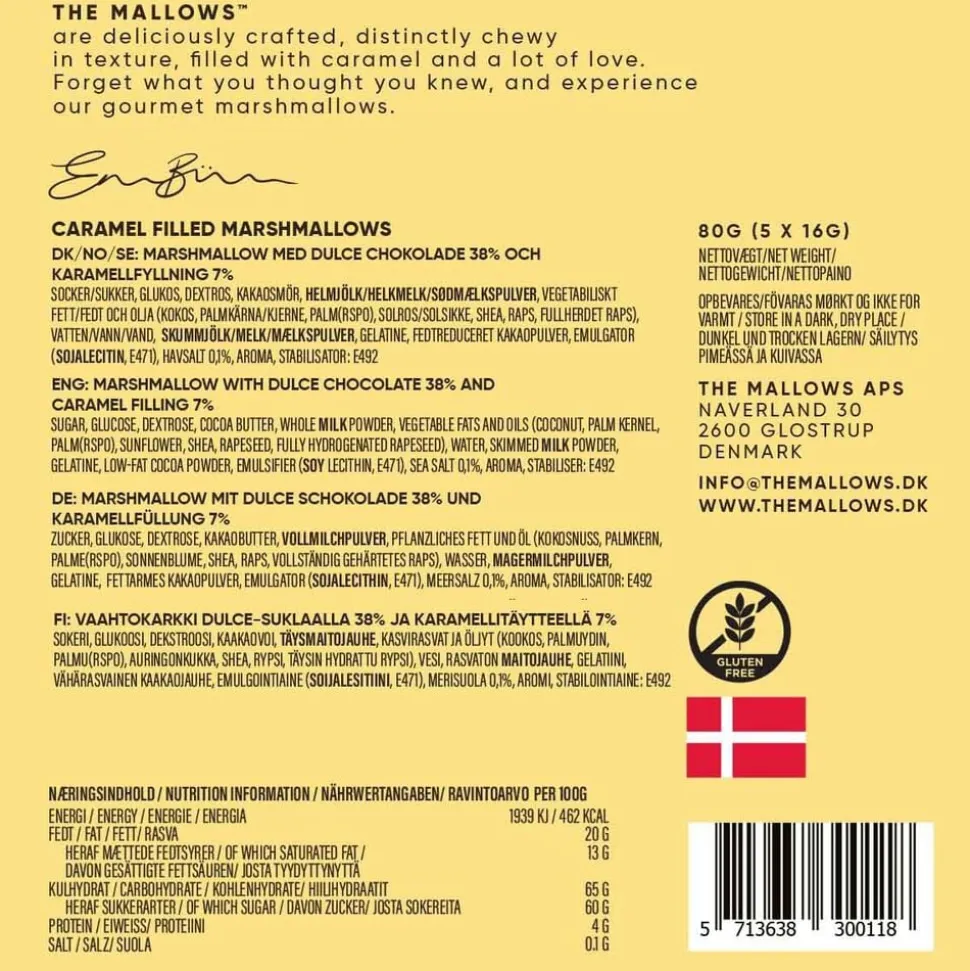 Dulce Chocolate + Maldon Sea Salt Flakes er karamelfyldte skumfiduser dragéret med fyldig, karamelliseret hvid chokolade – også kendt som den populære dulce chokolade. Den bløde kerne smelter sammen med vanilje skumfidusen og de knasende stykker havsalt ved første bid – og komplimenterer den søde dulce chokolade helt perfekt.