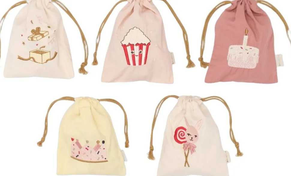 Celebration Bag 5-pack Rose Mix fra Fabelab er en sød samling stofposer i rosa, lyserød, creme og lysegul. Alle poser er pyntet med broderier af slik, kager og gaver og gør det ekstra hyggeligt at pakke små fødselsdagsgaver ind på en sjov og genbrugelig måde. De passer perfekt sammen med resten af Celebration Rose Mix-serien for et festligt og farveafstemt udtryk.