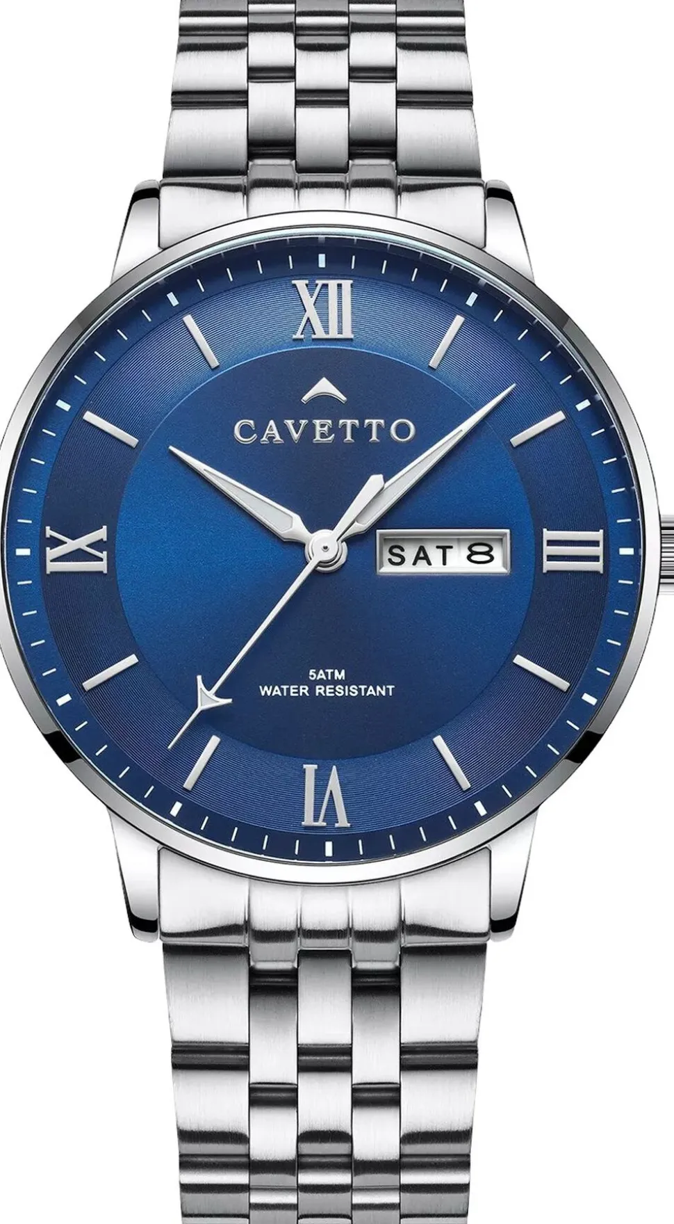 Den blå urskive på Cavetto Classic CV0046 står i smuk kontrast til dens sølvfarvede urkasse og bezel, alle fremstillet af rustfrit stål. Den rustfri stål lænke komplementerer det samlede design og er sikret med en butterfly lås for nem brug. Uret er udstyret med et kvarts urværk, der sikrer præcis tidsvisning. Det safirbelagte mineralglas beskytter urskiven og tilbyder ridsemodstand til daglig brug. Med en vandtæthed på 5 ATM er dette ur egnet til let vandkontakt, såsom regn eller håndvask.