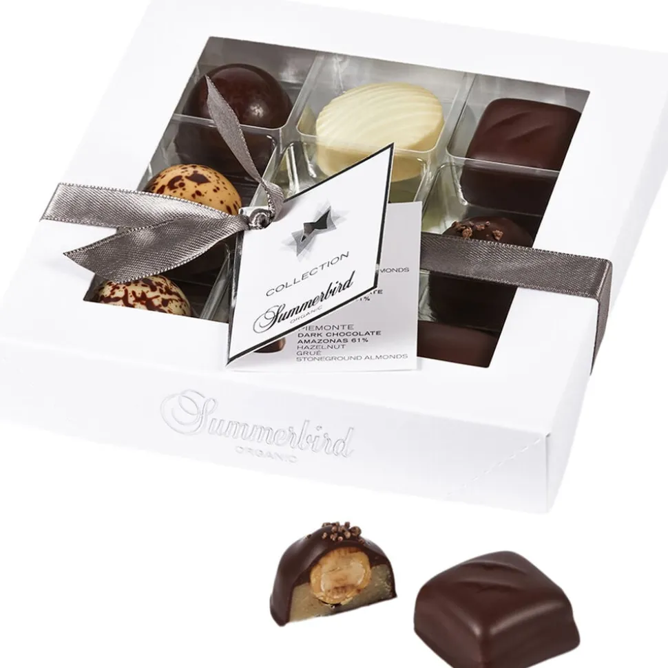Collection 9 indeholder 9 forskellige varianter af vores raffinerede, klassiske fyldte chokolader. Æsken byder delikat velsmag i form af blandt andet marcipan af stenvalsede middelhavsmandler, praliné, mynte og karamel.