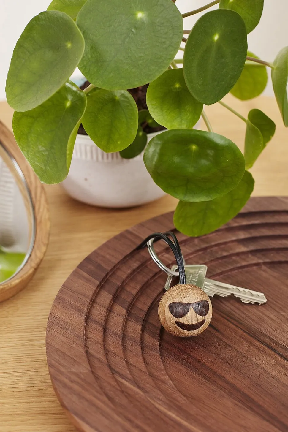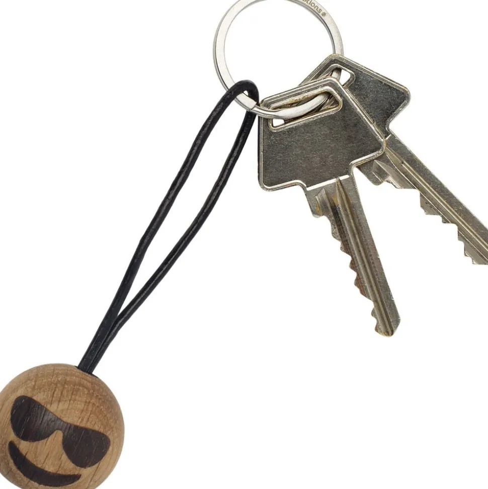 Cool giver lidt ekstra energi til hverdagen. Emojien med det smarte udtryk er sjov at kigge på og så holder den styr på dine nøgler imens. Selve trækuglen er lavet i eg og bliver forbundet til ringen via en læderstrop.