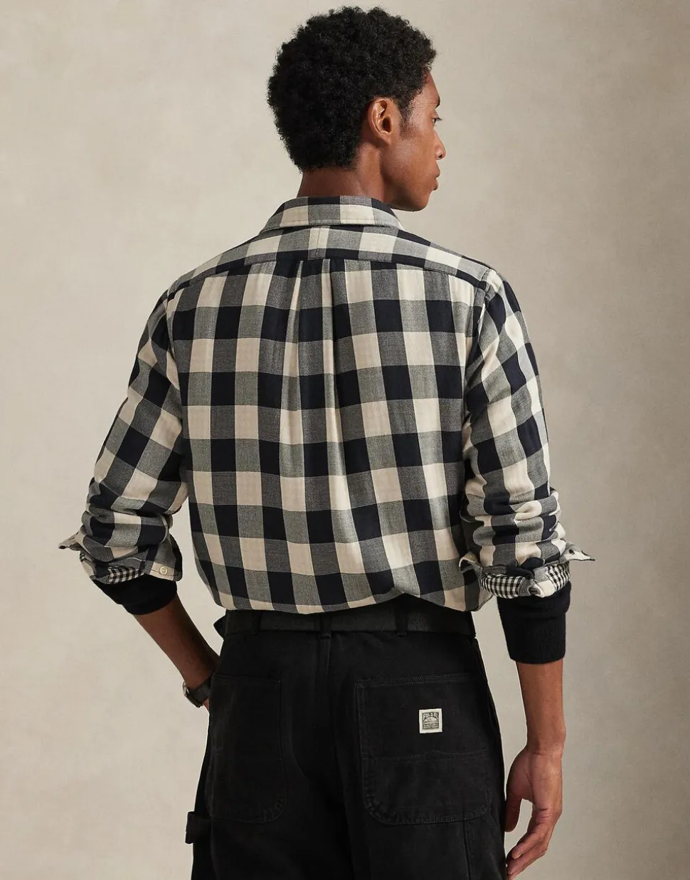 Denne ternede skjorte i dobbeltsidet bomuld har kontrasterende inderside, der er synlig, når ærmerne er rullet op
