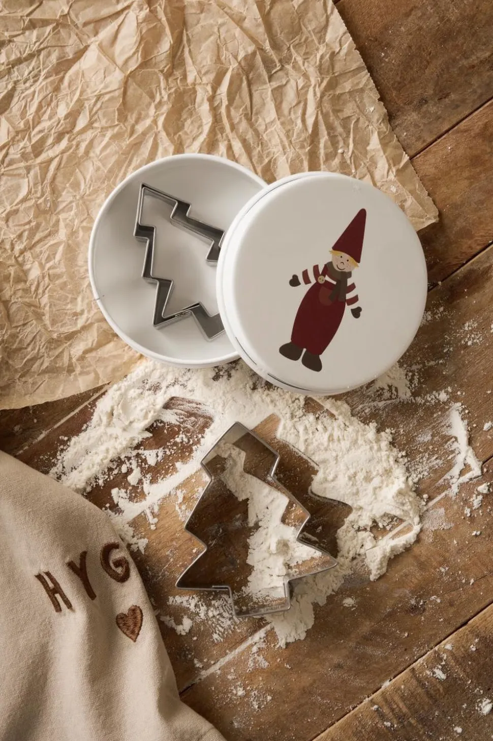 Dåse m/3 juletræ-kageudstikkere, nisse på låget