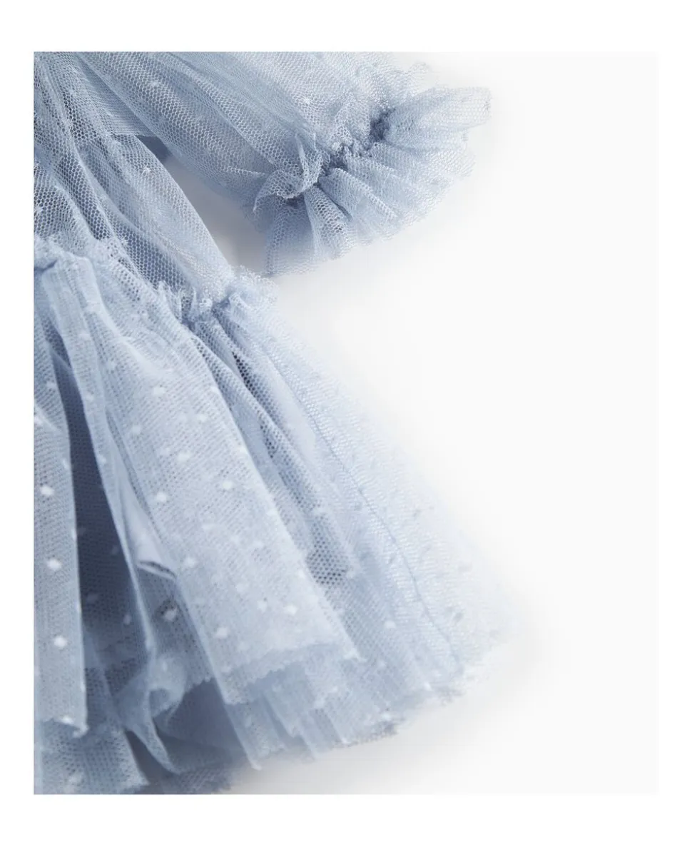 Langærmet kjole til de mindste med masser af volumen og flotte tylflæser. Kjolen er pyntet med prikker og har knaplukning bagpå. Kjolens længde går til over knæet.