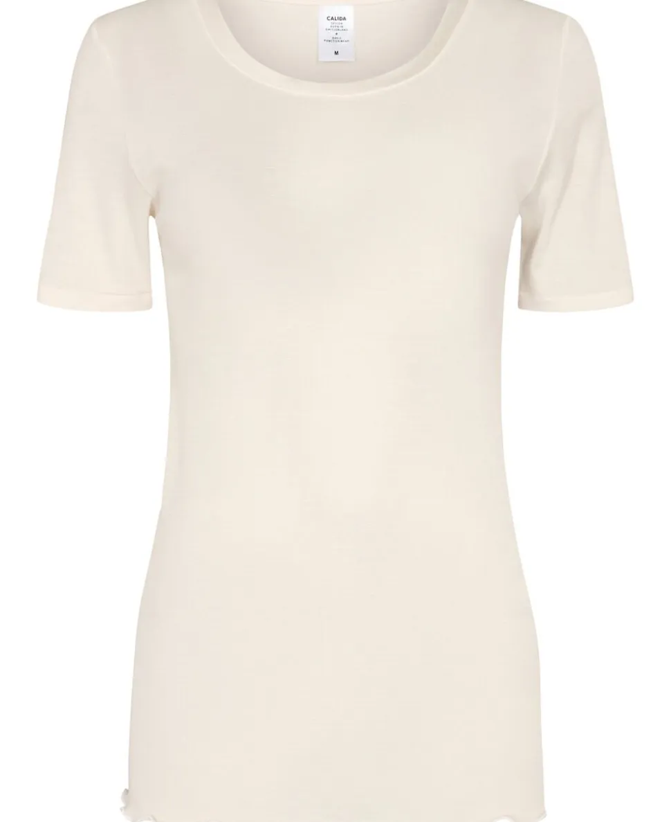 T-shirt fra Calida i den blødeste kvalitet af merinould og silke. Denne kombination af to naturlige materialer skaber tilsammen en varmeregulerende kvalitet, der både er let, varm og blød. Derudover er T-shirten enkel i modellen med korte ærmer, en rund halsudskæring samt en tætsiddende pasform. En praktisk T-shirt af den absolut bedste kvalitet.
