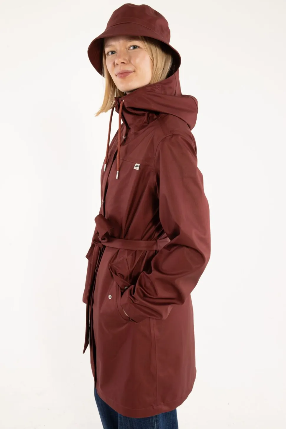 Regnfrakken er i et blødt og stretchy materiale, der falder smukt og samtidig er ekstremt vandtæt (10.000 mm) takket være en membran på bagsiden. Alle sømme er tapede, og så er regnfrakken naturligvis åndbar som alle Danefæs frakker. Det sikrer dig optimal komfort, når du bevæger dig i regnen. Regnfrakken har en enkel, lang og feminin pasform med bindebælte i livet. En dobbeltlynende vandtæt lynlås foran, der kan lynes nedefra og op, gør sammen med det elastiske materiale frakken dejligt cykelvenlig. Lynlåsen er dækket af et frontstykke, som lukkes med trykknapper.