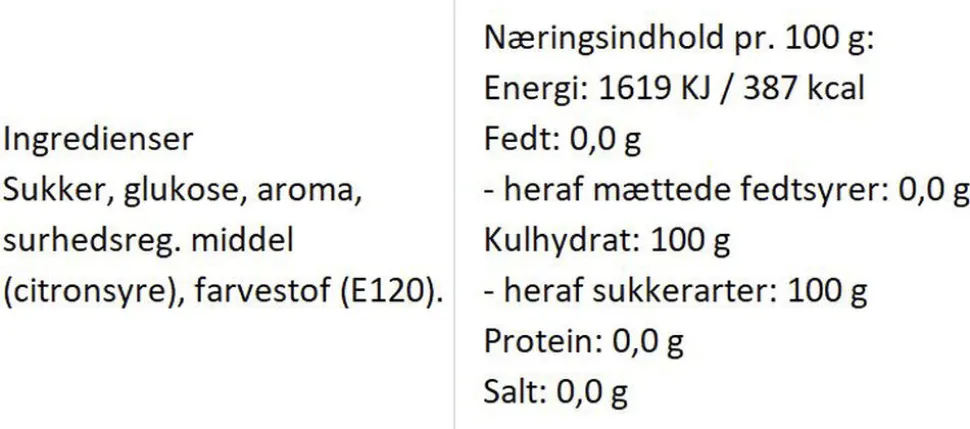 Sukker, glukose, aroma, surhedsreg. middel (citronsyre), farvestof (E120).