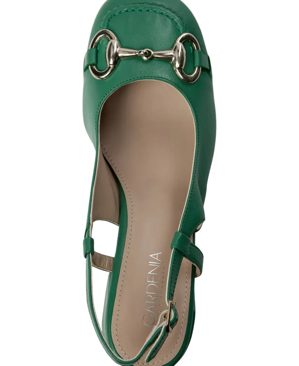 Slingback-pumps i læder med firkantet tå. Skoen er dekoreret med et guldspænde over forfoden og har en justerbar ankelrem. Delta-pumps er fremstillet på en skulpturel blokhæl, som giver skoen et moderne look. Materiale: Læderfarve: Grøn hæl: 7 cm størrelsesguide: Normal