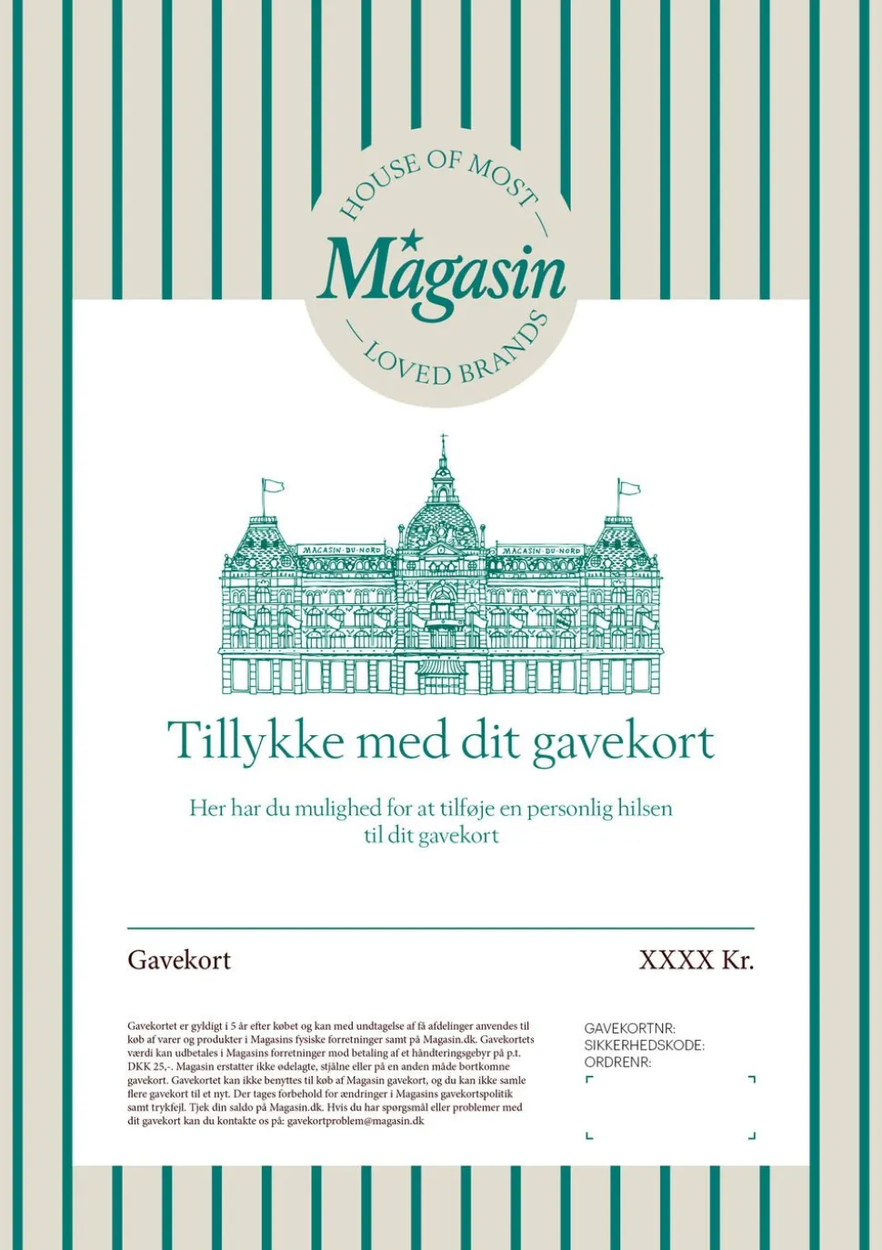 Gavekortet er gyldigt i 3 år efter købet og kan, med undtagelse af få afdelinger, anvendes til køb af varer og produkter i Magasins fysiske forretninger samt på Magasin.dk.