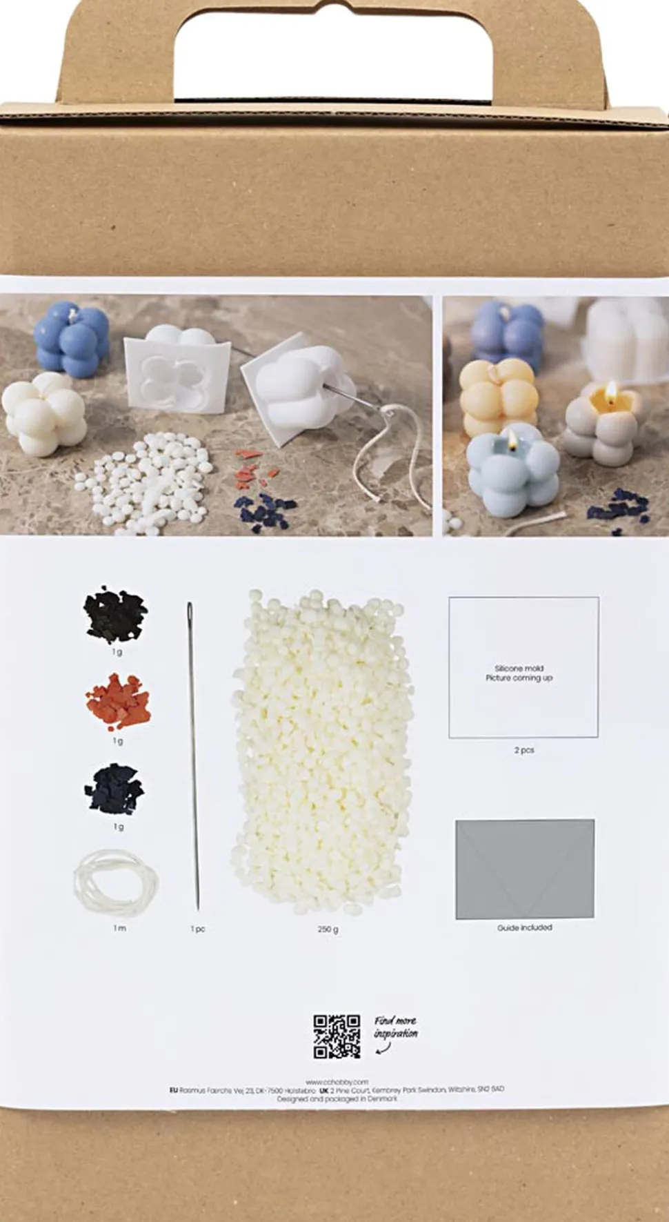 Med dette kit kan du støbe dine egne bubble lys i flotte farver. Indeholder materialer til seks lys, og al den vejledning du behøver. Er du vild med de populære bubblelys fra butikkerne, er dette kit lige noget for dig. Her kan du lave seks bubblelys fra bunden. Lysene støber du i 100 % vegansk soyavoks en naturmateriale, som udleder 80-90 % mindre sodpartikler end alm. stearinlys. Hvis du vil, kan du også farve lysene i blå, hvide og beige nuancer.