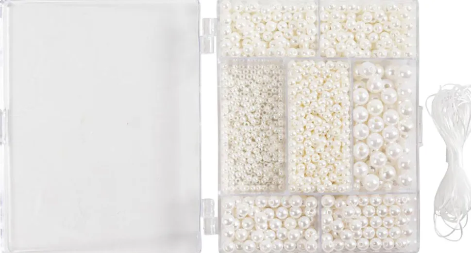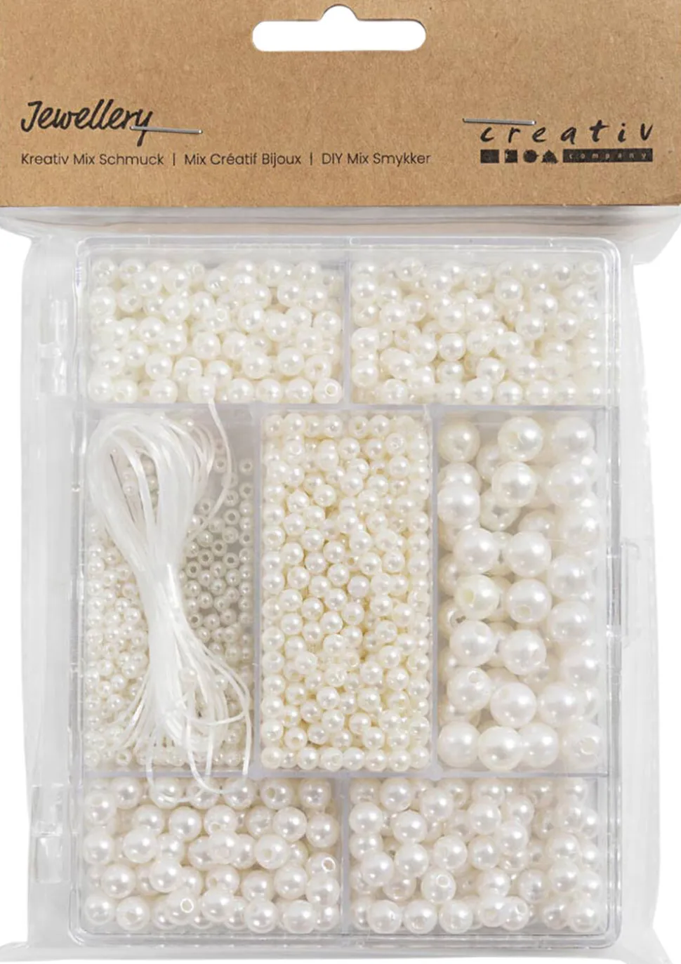 Med dette mix kan du nemt designe dine egne unikke perlesmykker med perlemorshvide perler. Indeholder alle de materialer og al den vejledning, du har brug for. Elsker du at lave dine egne perlesmykker, er vores smykkemix perfekt. Her får du over 850 perlemorshvide perler, som du frit kan mikse og matche. Perlerne kommer i flere forskellige størrelser – lige fra de små, fine til de store, klassiske – så designmulighederne er uendelige. Træk blot perlerne på smykkeelastikken, og skab unikke halskæder og armbånd.