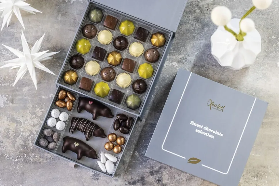 Smuk gaveæske med 25 fyldte chokolader med lækre smage som saltkaramel, lakrids, marcipan, citron,