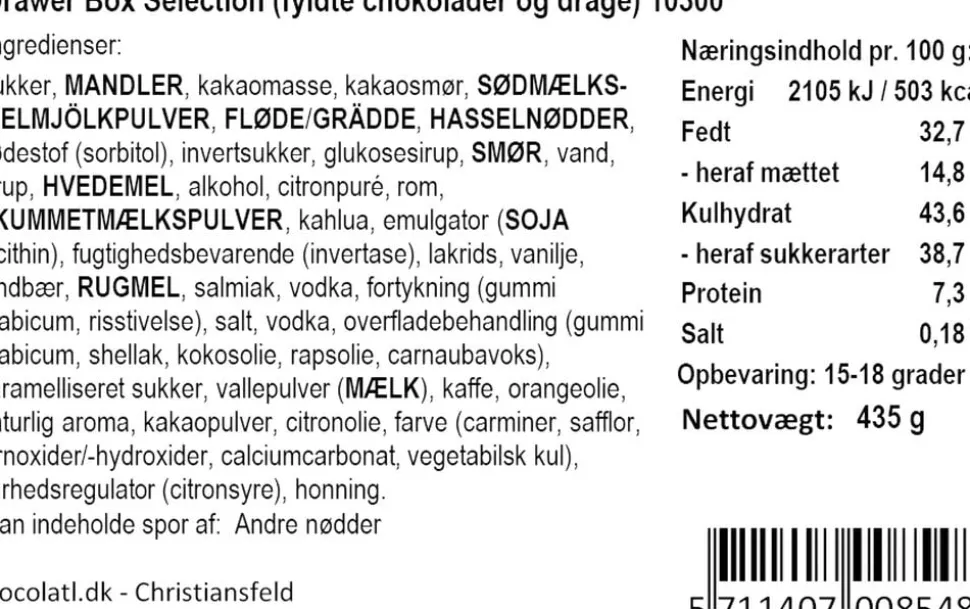 overtrukket med 70% mørk chokolade og hånddekoreret med hvid chokolade. Derudover et lækkert
