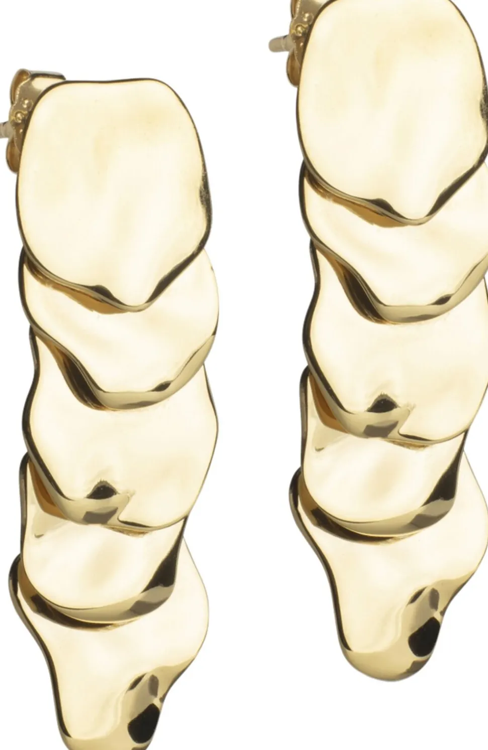 Bemærk- Prisen er pr. par Om smykket- Vores Sahara ørering i guld er en festlig, statement ørering, der bliver et hit til den næste store begivenhed. Den brede, aflange form skaber et ekstravagant udtryk, og de overlappende, bevægelige plader, giver øreringen dybde og særklasse. De overlappende guldplader giver associationer til Sahara ørkenens bølgende sandbanker, og naturlige formationer. Sahara øreringene er belagt med 18 karat guld, men findes også i rent 925 sterlingsølv.