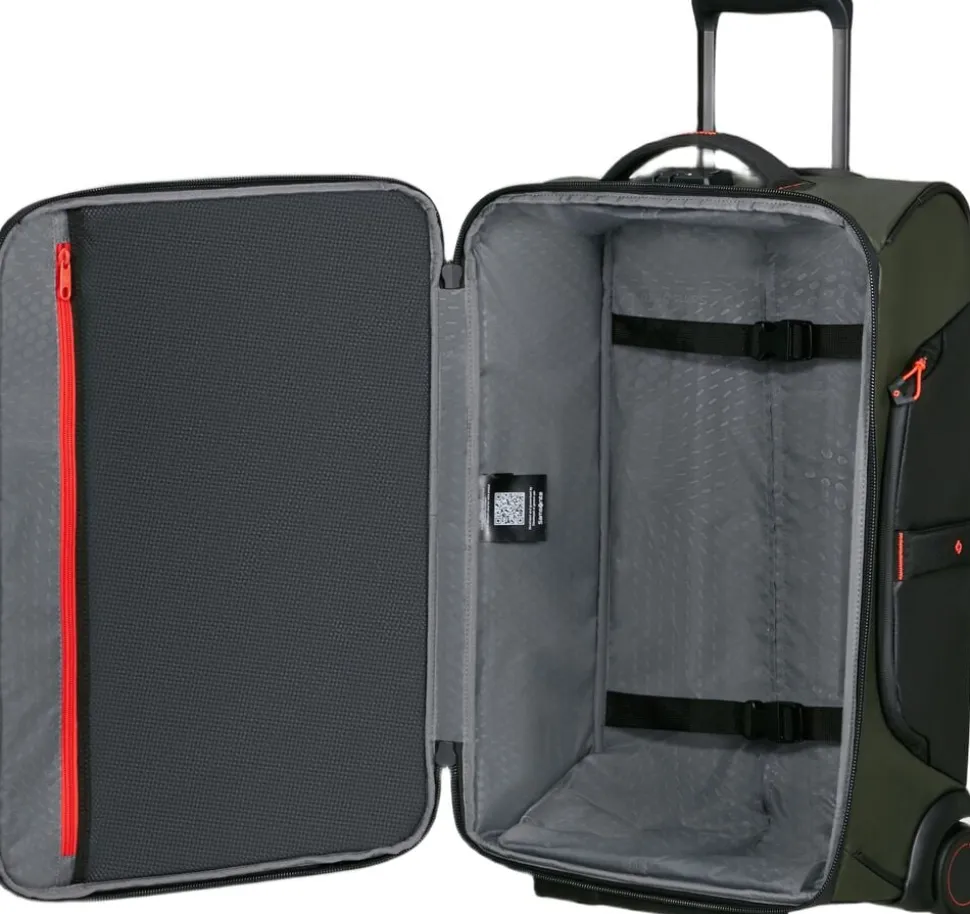 Duffle på hjul der passer til de fleste flyselskabers kabinemål 40x55x20 cm. både det udvendige og indvendige stof er lavet af genbrugt nylon og polyester, vandafvisende materiale, front og sidelomme, TSA lås, rumindhold 48 liter, vægt 2,5 kg. 5 års begrænset garanti.
