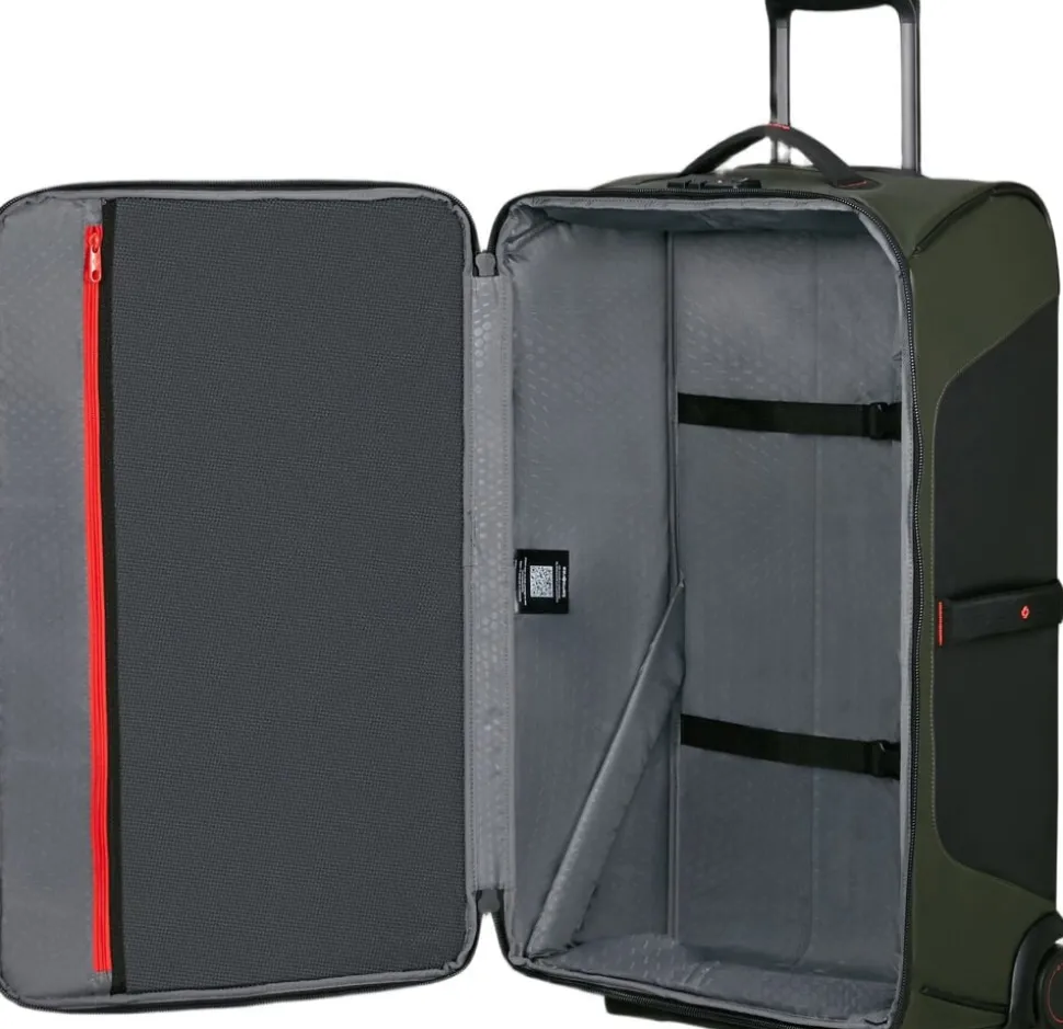 Duffle på hjul hvor både det udvendige og indvendige stof er lavet af genbrugt nylon og polyester, vandafvisende materiale, front og sidelomme, TSA lås, rumindhold 76 liter, vægt 2,9 kg. 5 års begrænset garanti.